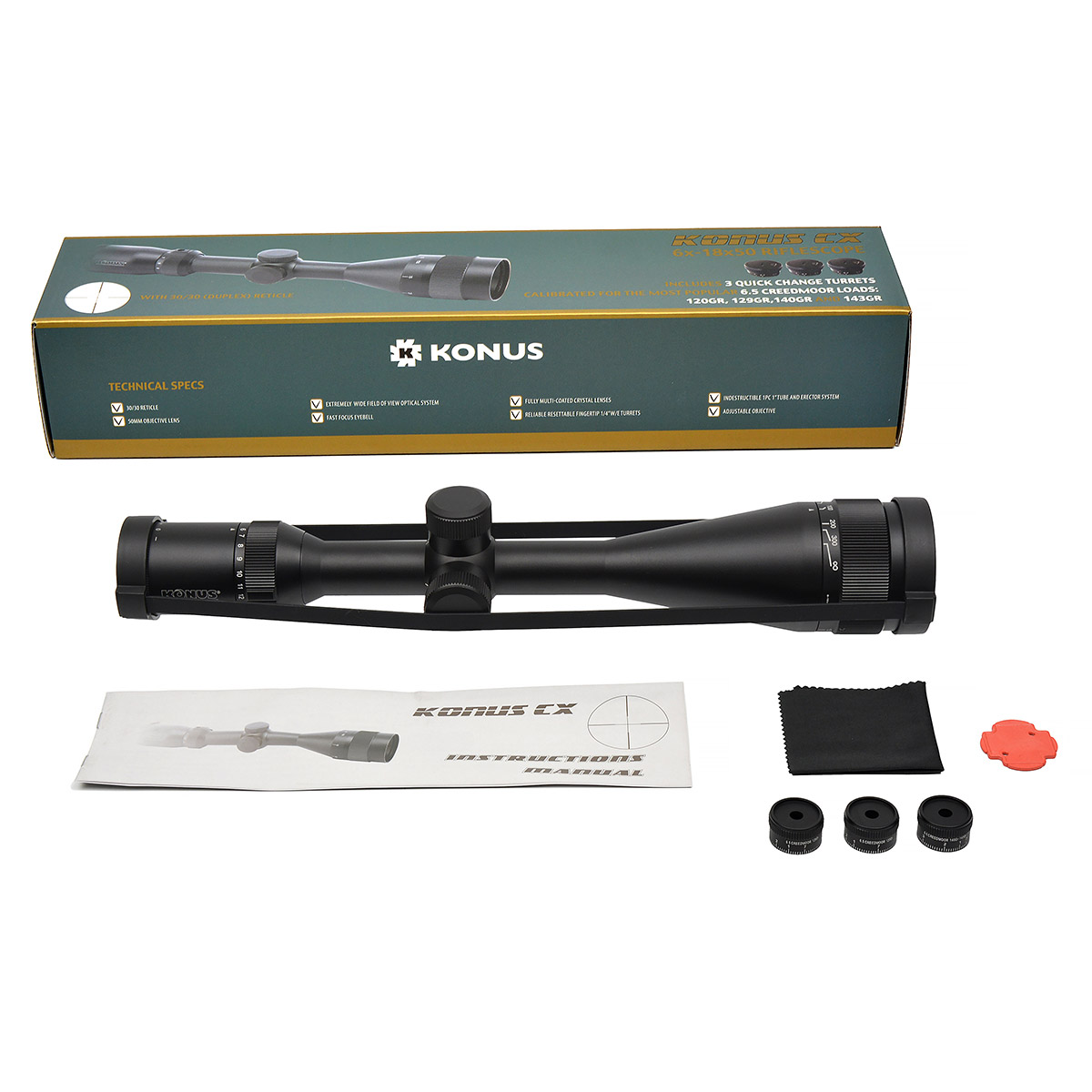 Конструкція Konus CX 6-18x50 відповідає всім сучасним вимогам: має повністю багатошарове просвітлення (FMC), захист від запотівання, ударостійкість та водонепроникність. Стандартна одно-дюймова трубка (25.4 мм) гарантує сумісність з більшістю кілець на ринку.