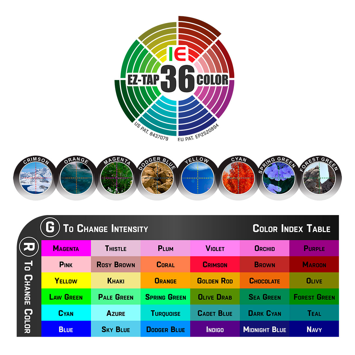 Головна особливість моделі – це інноваційна система підсвітки прицільної сітки EZ-TAP® Illumination Enhancing, яка дозволяє перемикатися між двома режимами: червоно-зелений двоколірний режим і 36-колірний режим. Функція пам'яті High-tech Illumination повертає вас до останніх налаштувань кольору/яскравості.