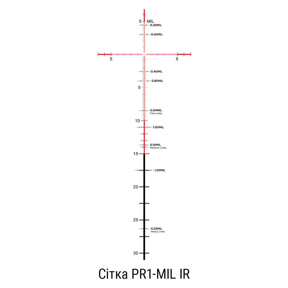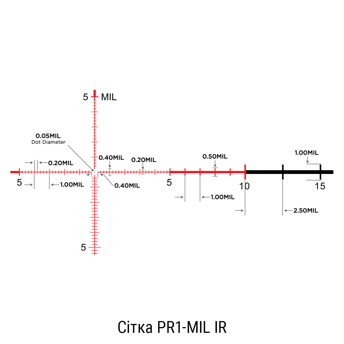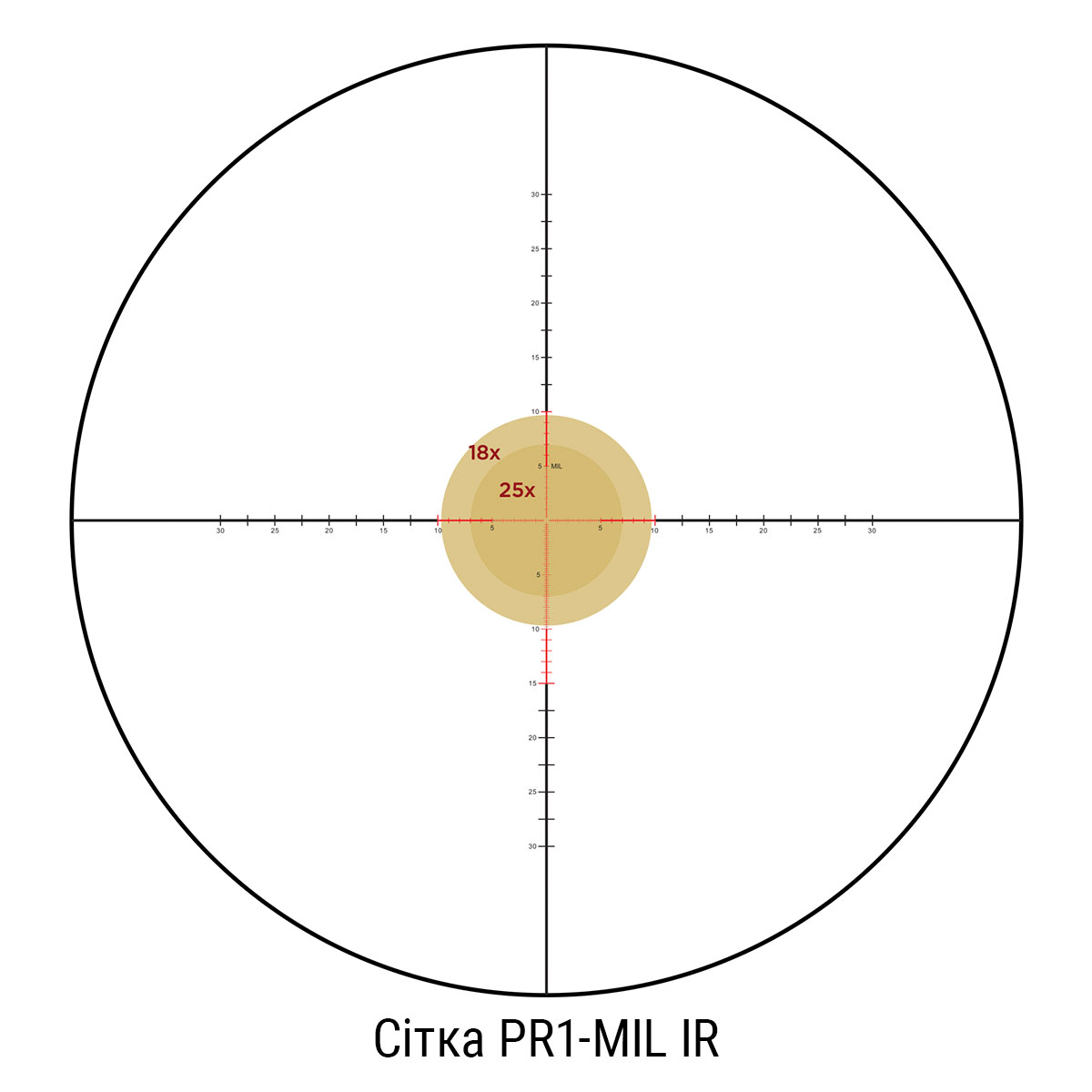 Прицільна сітка PR1-MIL виконана у вигляді звичайного перехрестя, але має додаткові мітки для зручності стрільби на різних дистанціях, знаходиться у першій фокальній площині та має підсвічування червоного кольору з регульованим рівнем яскравості (7 рівнів), завдяки чому навіть при високій яскравості денного світла зберігається чудова видимість сітки. Система з урахуванням MIL є поточним військовим стандартом, а основна особливість першої фокальної площини – це те, що поділки на прицільній марці зберігають своє справжнє значення незалежно від збільшення.