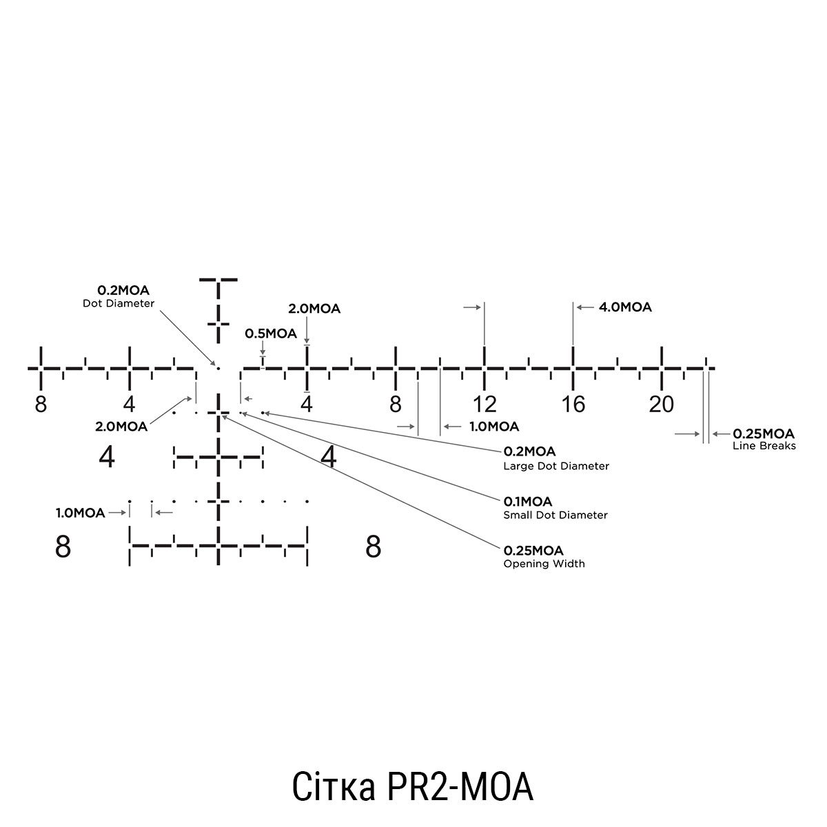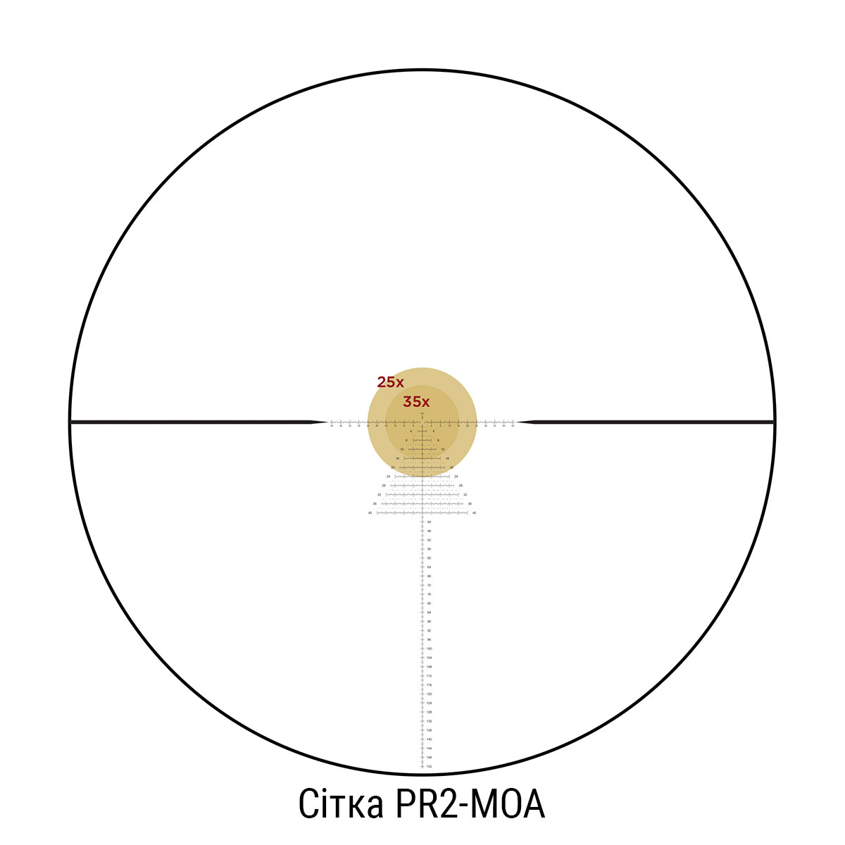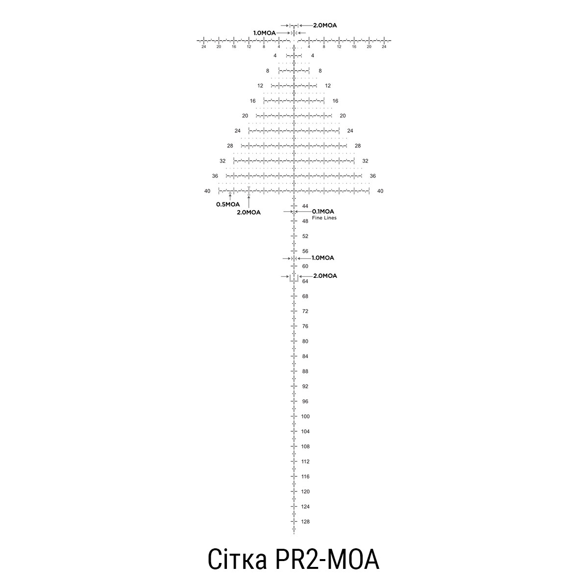 Крім того, корекція діоптрій і система Fast-Focus окуляру гарантує миттєве встановлення фокуса на цілях. Бічна (Side Focus) відстройка паралаксу забезпечує точність влучання в мішень на будь-яких дистанціях і зручне обертання маховика під час виконання тактичних завдань. Балістична прицільна сітка типу PR2-MOA у першій фокальній площині має безліч міток та дає змогу безпомилково оцінити відстань до цілі і точно влучити в неї.