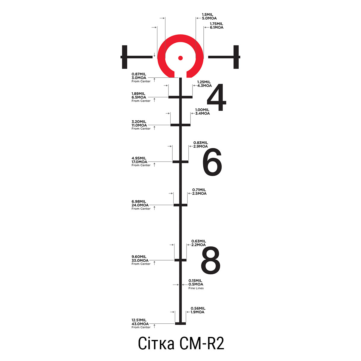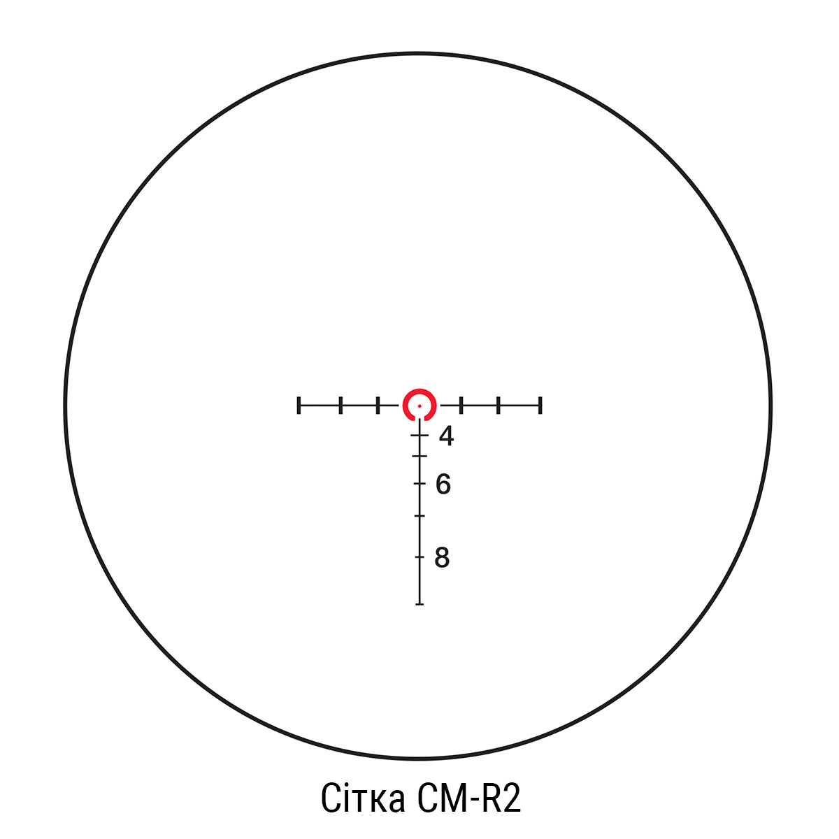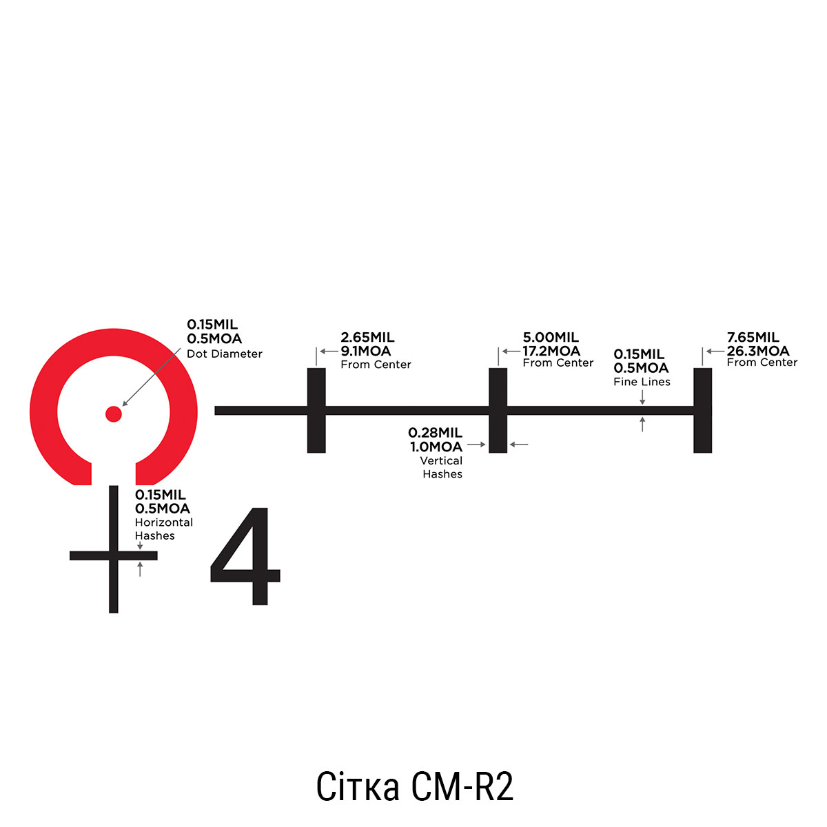 Точність налаштувань прицільної сітки CM-R2 забезпечуються надійними барабанами – CDS-ZL2 (ZeroLock 2) для висоти та Pop-Up Rezero для вітру. Максимальний діапазон регулювання як висоти, так і вітру складає 170 MOA або 49 MIL. Крок регулювання механізму поправок – 1/4 MOA.