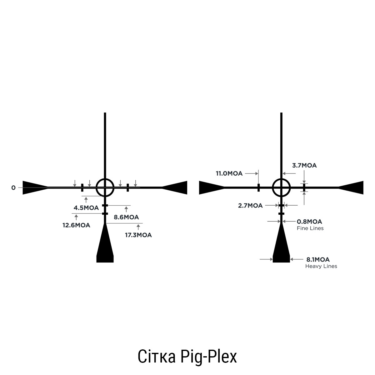 Прицільна сітка Pig-Plex розташована у другій фокальній площині та виконана у вигляді звичайного перехрестя. Гарантує швидке відстеження об'єкта, не перекриваючи його своїми розмірами.