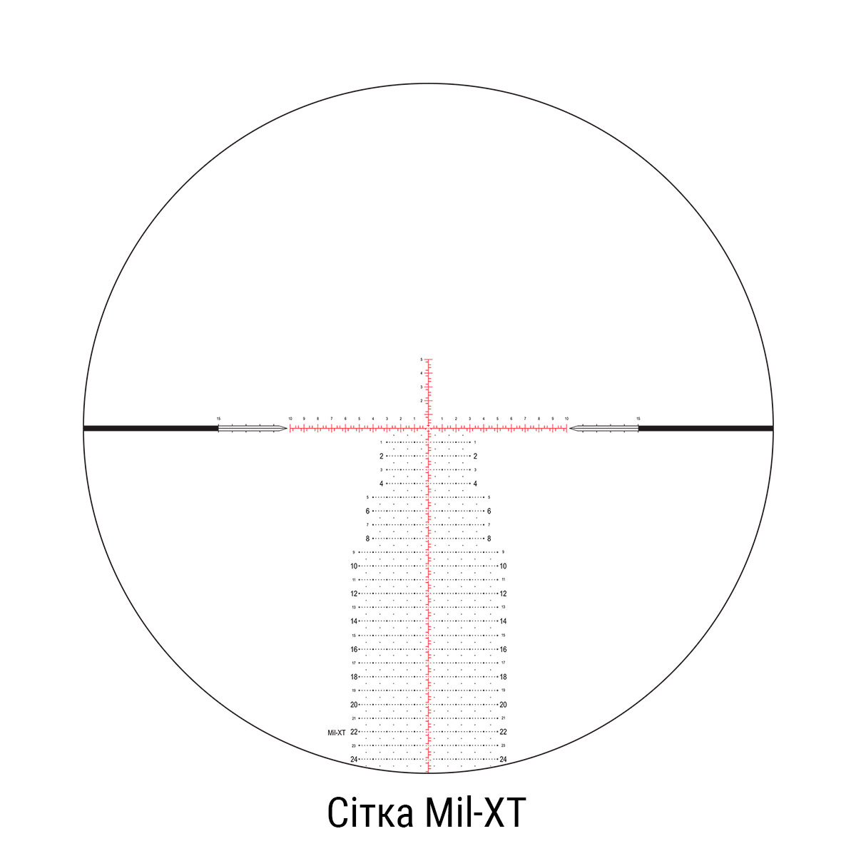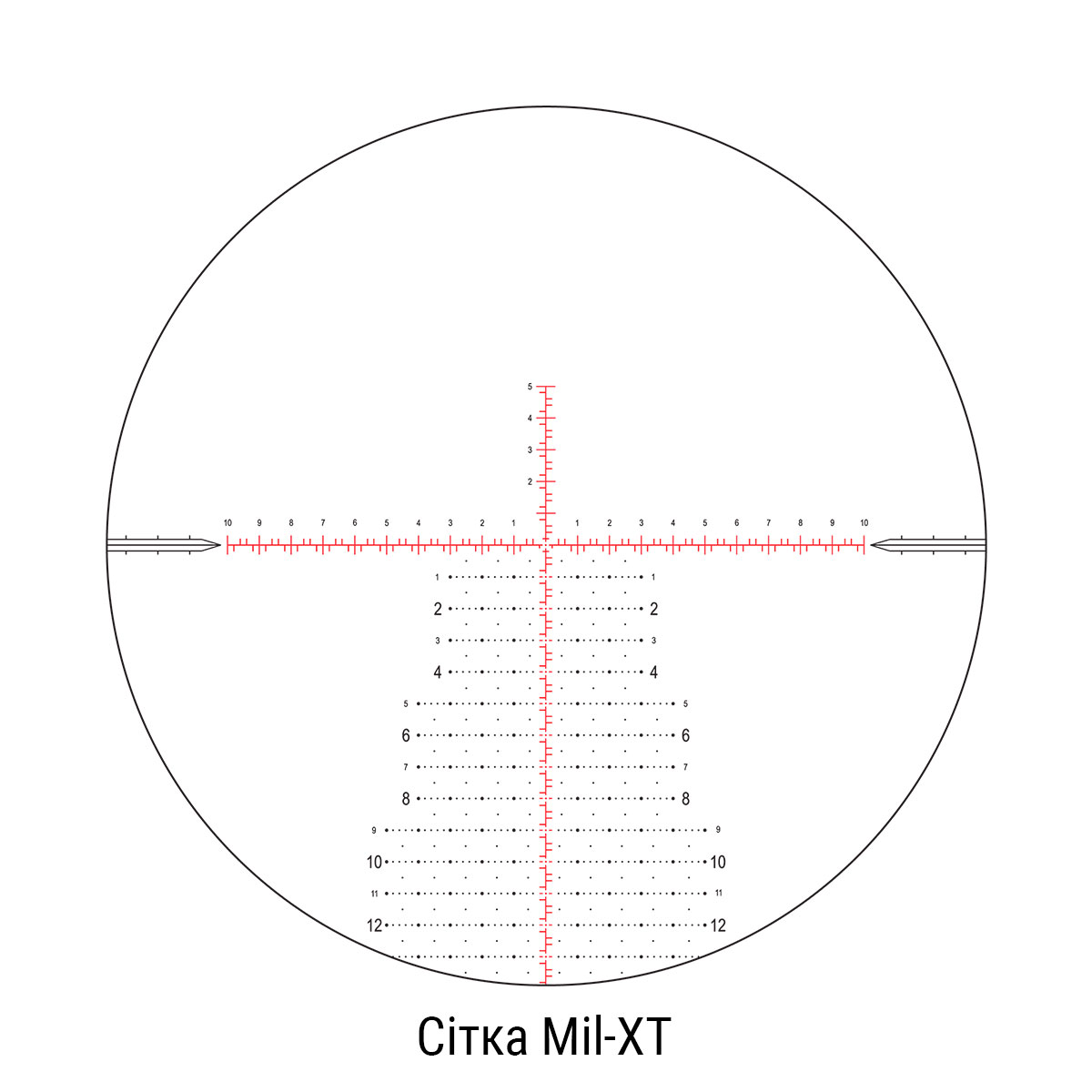 Сітка Mil-XT™ є унікальною розробкою компанії. Поділки на прицільній марці зберігають своє справжнє значення незалежно від збільшення, що є основною перевагою першої фокальної площини. Сітка спеціально розроблена для високоточної змагальної стрільби на далекі дистанції і дозволяє чітко оцінити ціль. Для підсвічування використовується унікальна технологія цифрового підсвічування Digillum™, яка надає перевагу у швидкості прицілювання над іншими прицілами у нічний час. Зручна бічна відстройка паралакса (Side Focus) регулюється від 10 м і до нескінченності.