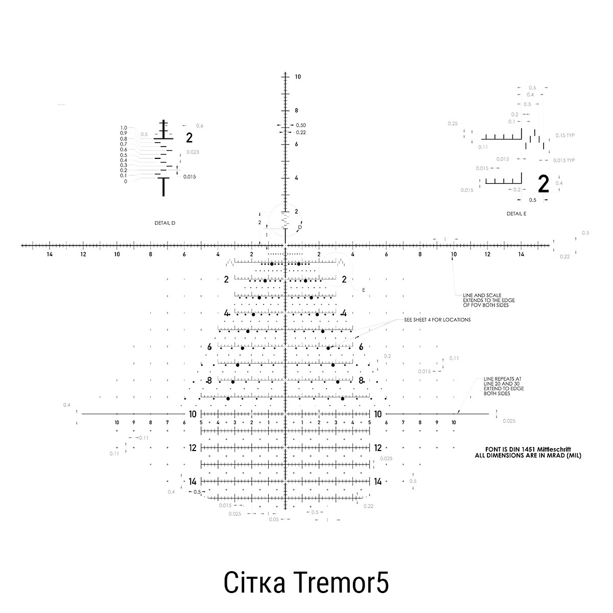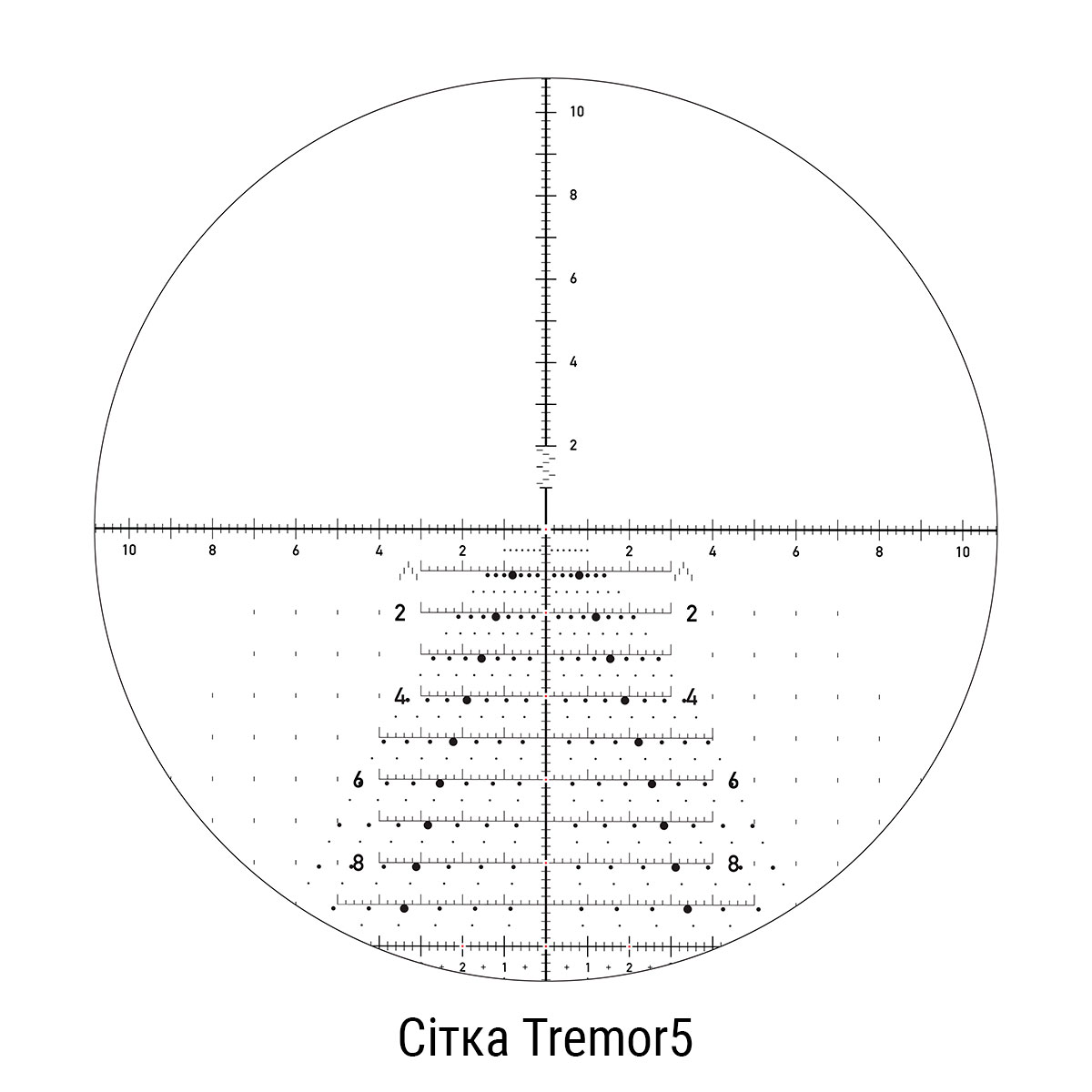 Прицільна сітка Tremor5™ розташована в першій фокальній площині, тому кутові розміри сітки залишаються правильними за будь-якого збільшення. Головною особливістю сітки є можливість ведення прицільної стрільби на великі відстані з можливістю швидкого корегування поправок. Сітка дозволяє візуально розміщувати ціль на відповідних горизонтальних та вертикальних лініях для візуального коригування поправок без необхідності крутити барабани або рахувати кліки. Система підсвітки реалізована за допомогою унікальної технології Digillum™, яка надає перевагу у швидкості прицілювання вночі у порівнянні з аналогічними рішеннями від конкурентів.