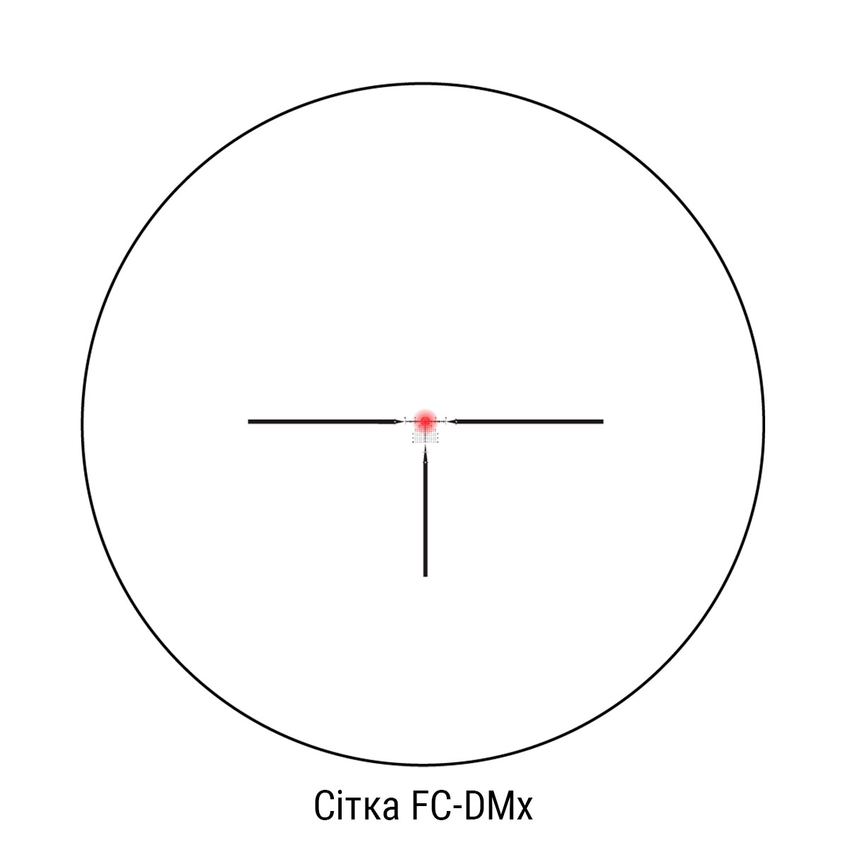 Балістична прицільна сітка FC-DMx з червоним підсвічуванням розташована у першій фокальній площині – вона масштабується при зміні кратності, тобто всі її елементи збільшуються пропорційно до зміни розмірів цілі. Кутові розміри сітки залишаються вірними за будь-якого робочого збільшення. Відстройка паралакса зроблена на заводі виробника – вона фіксована на 125 м.