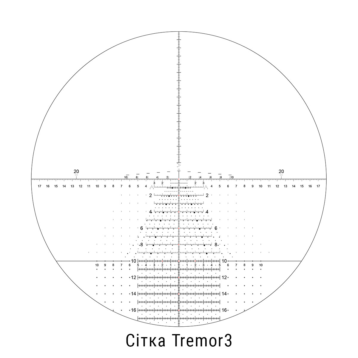 Прицільна сітка Tremor3™ розташована в першій фокальній площині. Головною особливістю сітки є можливість ведення прицільної стрільби на великі відстані з можливістю швидкого корегування поправок. Сітка дозволяє візуально розміщувати ціль на відповідних горизонтальних та вертикальних лініях для візуального коригування вертикальних та горизонтальних поправок без необхідності крутити барабани або рахувати кліки.