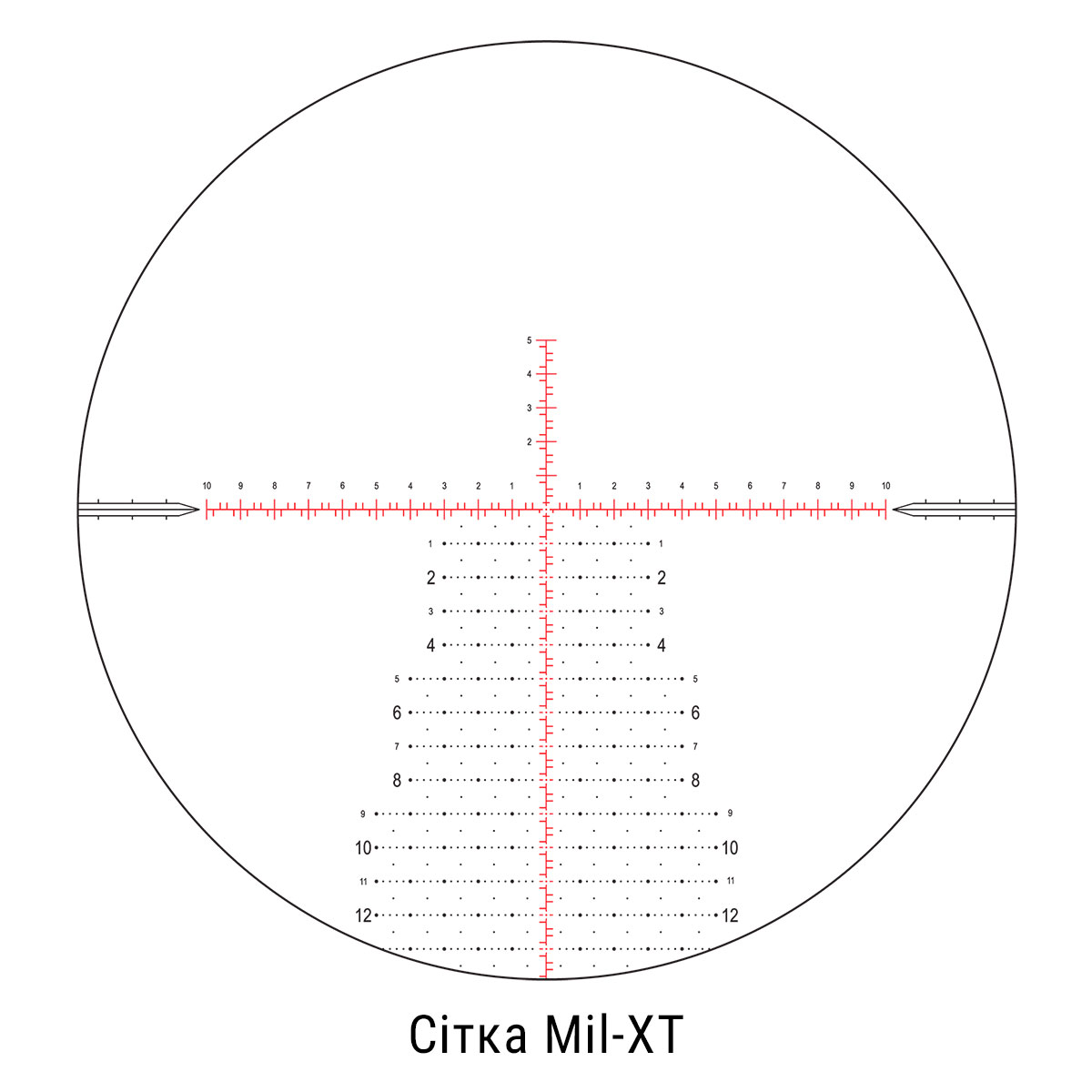 Балістична прицільна сітка Mil-XT з червоним підсвічуванням (унікальна технологія цифрового підсвічування Digillum™ від виробника) розташована у першій фокальній площині – вона масштабується при зміні кратності, тобто всі її елементи збільшуються пропорційно до зміни розмірів цілі. Кутові розміри сітки залишаються вірними за будь-якого робочого збільшення. Також варто виділити зручну бокову відстройку паралакса (Side Focus) від 10.06 м і до нескінченності.