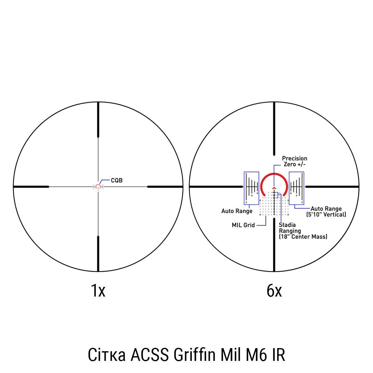 Перевагою прицільної сітки ACSS Griffin Mil M6 є інтегрована MIL-dot система визначення відстані до цілі для детальної оцінки на дистанціях до 549 м (600 ярдів) при збільшенні 6х, що забезпечує додаткову точність влучання в ціль. Сітка має спеціальну підкову та "шеврон" з підсвіткою, які гарантують максимально швидке прицілювання на невеликих відстанях при мінімальному збільшенні. Усього присутні 11 рівнів яскравості, що особливо актуально при яскравому денному світлі, адже на вищих рівнях інтенсивності підсвічування зберігається видимість підкови та "шеврона".