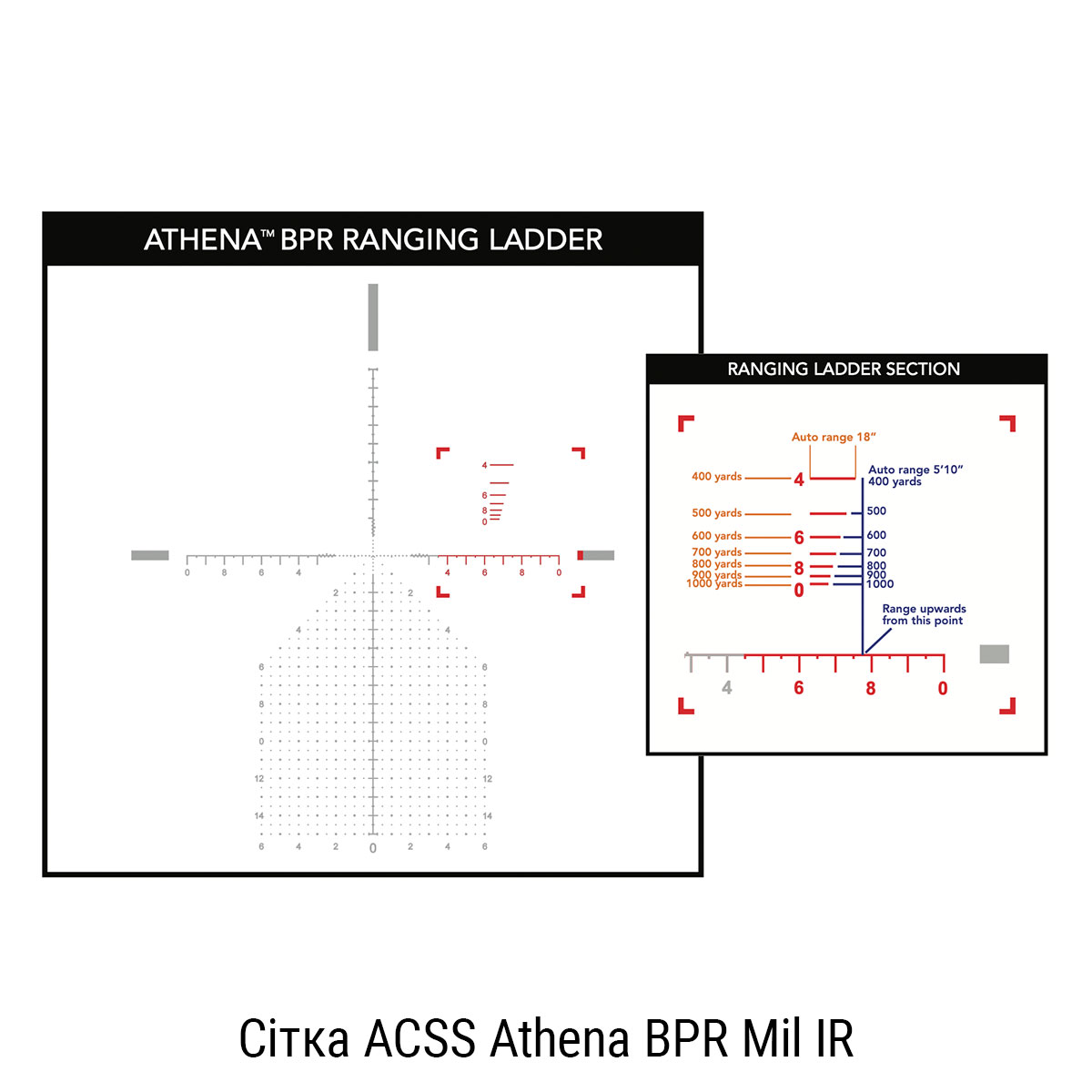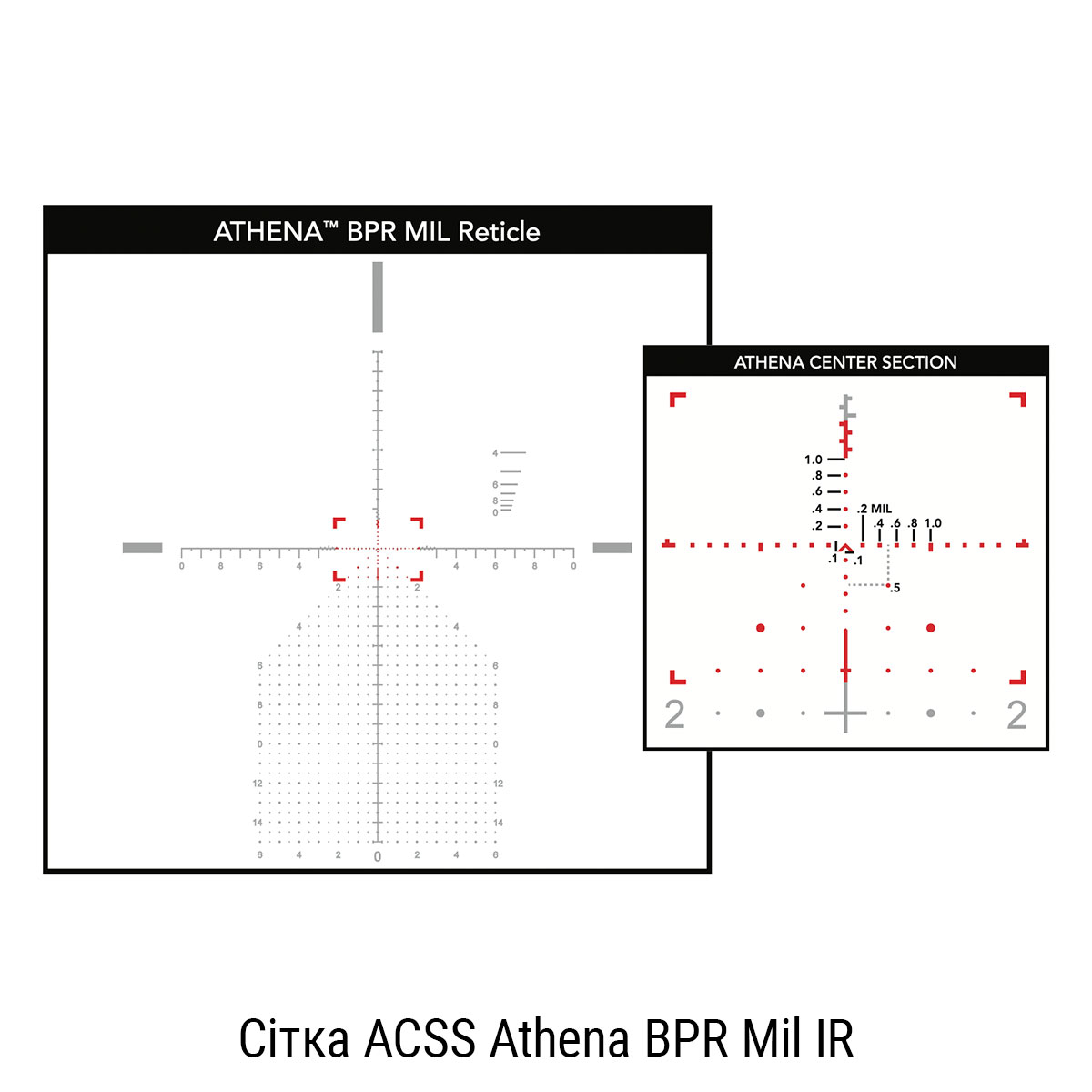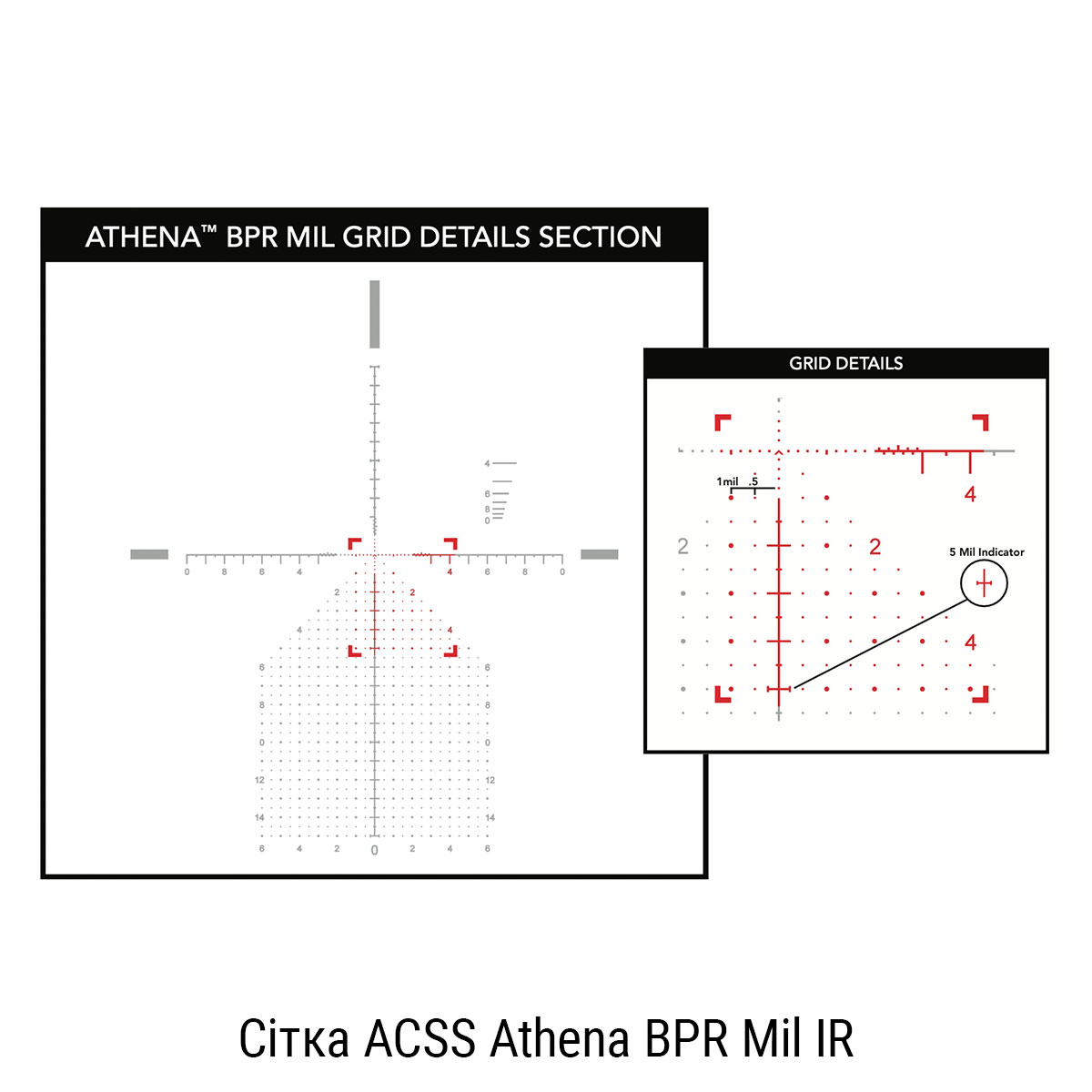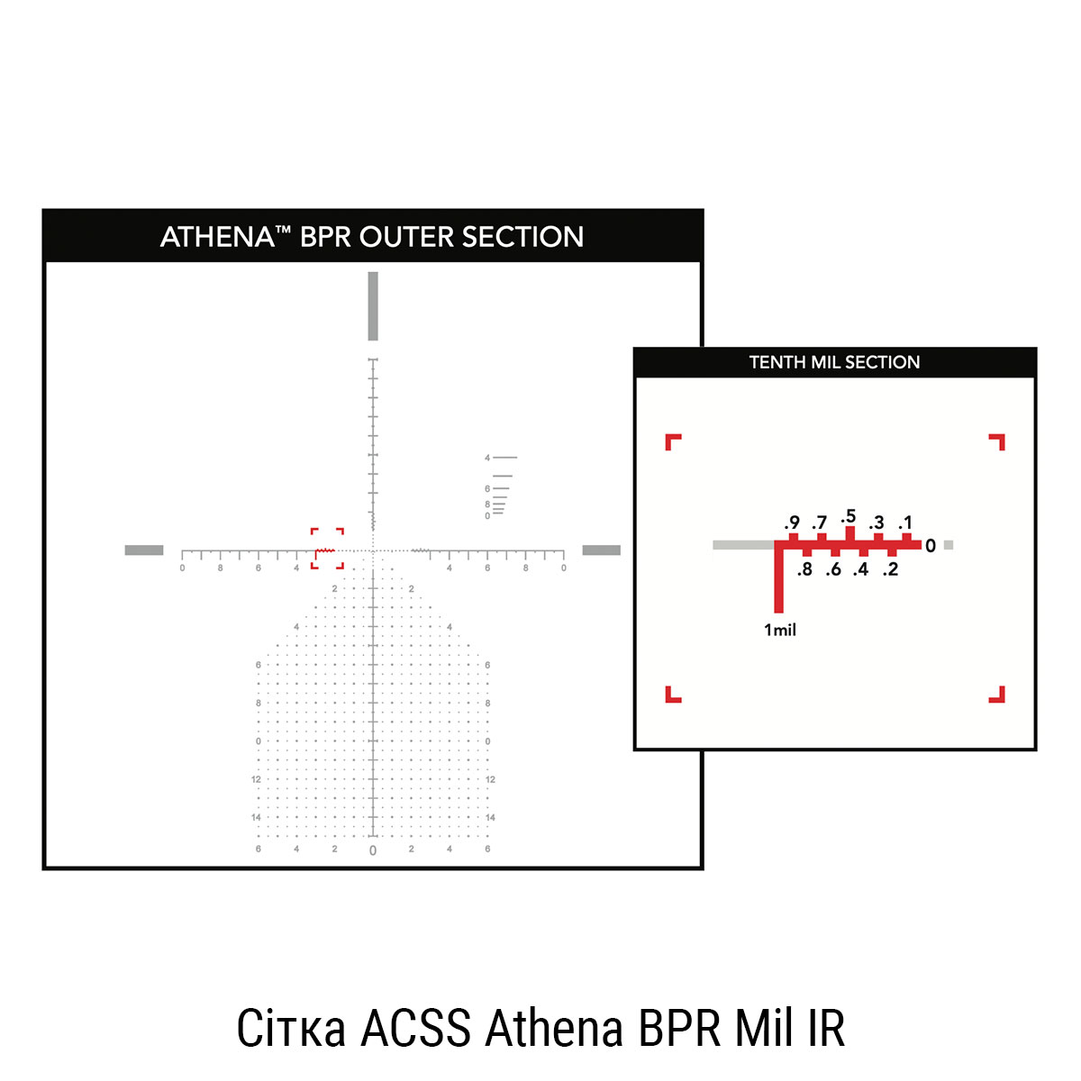Прицільна сітка ACSS Athena BPR MIL, розташована у першій фокальній площині, чудово проявить себе на найбільш віддалених відстанях з крупнокаліберними гвинтівками навіть за несприятливих умов тактичного середовища. Додатково сітка має функцію підсвічування, видиме навіть за умов яскравого денного світла за найвищих налаштувань. Також присутня сумісність з приладами нічного бачення на найнижчих рівнях інтенсивності підсвічування.