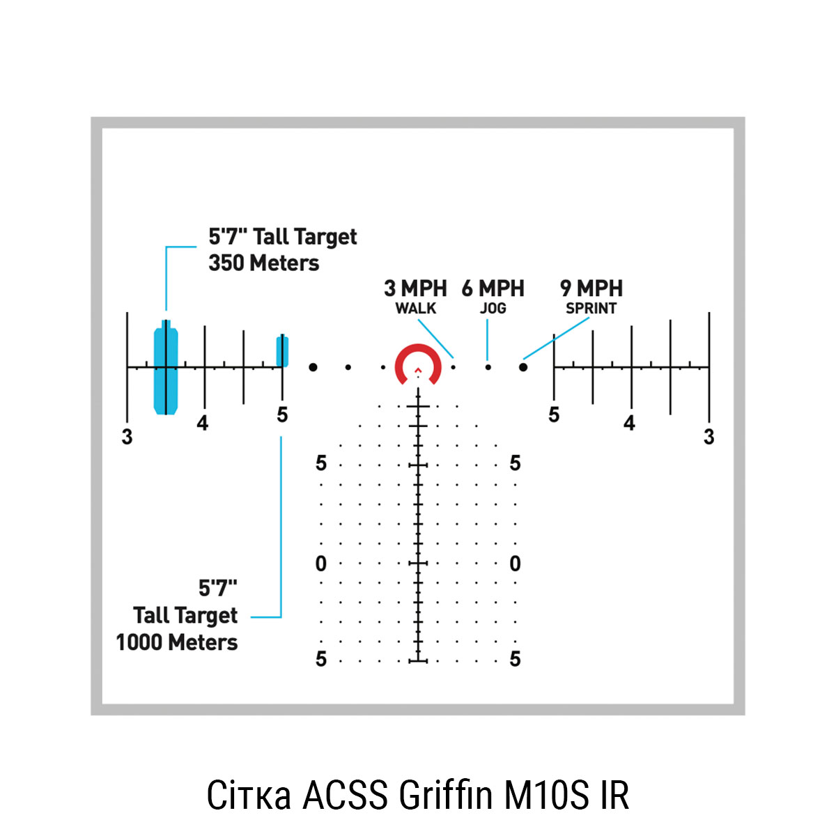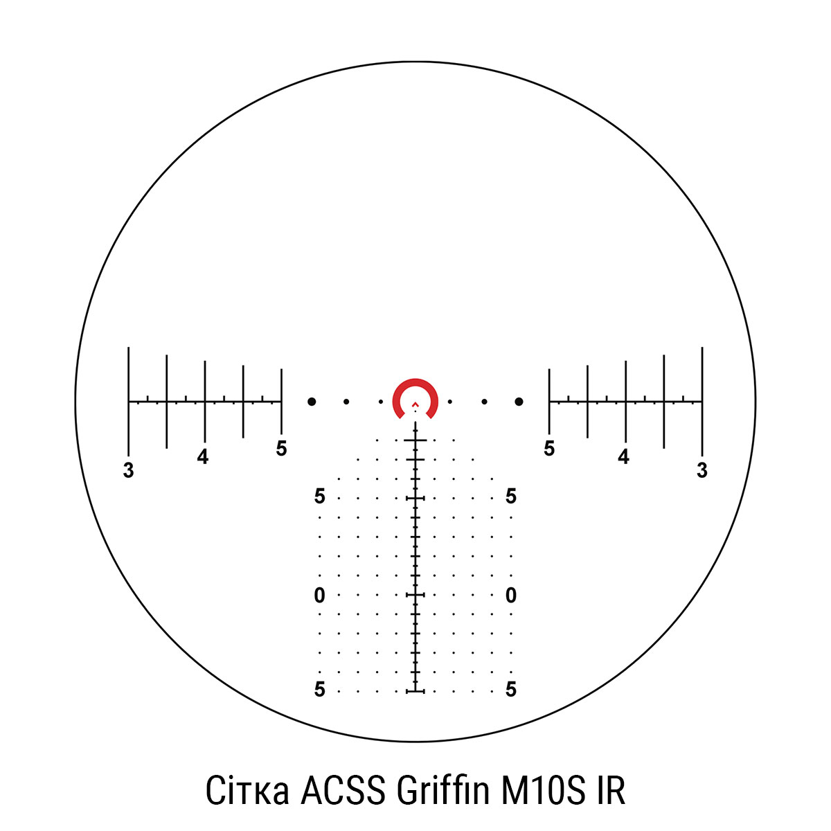 Особливість даної позиції – фірмова прицільна сітка ACSS Griffin MIL M10-S, розміщена у другій фокальній площині, спроєктована для роботи на невеликих та середніх відстанях з урахуванням максимально допустимим оптичним збільшенням 10х. Додатково прицільна сітка має підкову і точку – для моментального прицілювання на близьких відстанях, і спеціальний шеврон. Сітка має функцію часткового підсвічування червоного кольору з 11 режимами яскравості, 2 яких призначені для приладів нічного бачення..