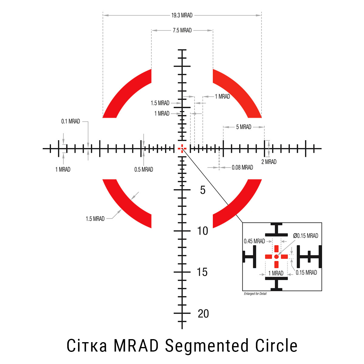 Прицільна сітка MRAD Segmented Circle виконана у вигляді перехрестя з мітками та часткового кола, яке поділено на 4 частини, кожна з яких віддалена від перехрестя та не перетинає його. Центральна область та сегменти кола мають регульоване 10-ступеневе підсвічування червоного кольору з можливістю вимкнення у проміжних значеннях. Джерелом живлення виступає батарейка CR2032, яка входить до комплектації оптики.