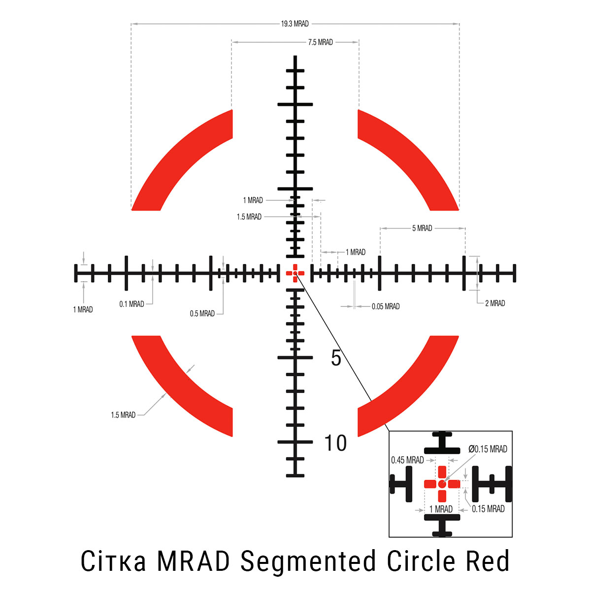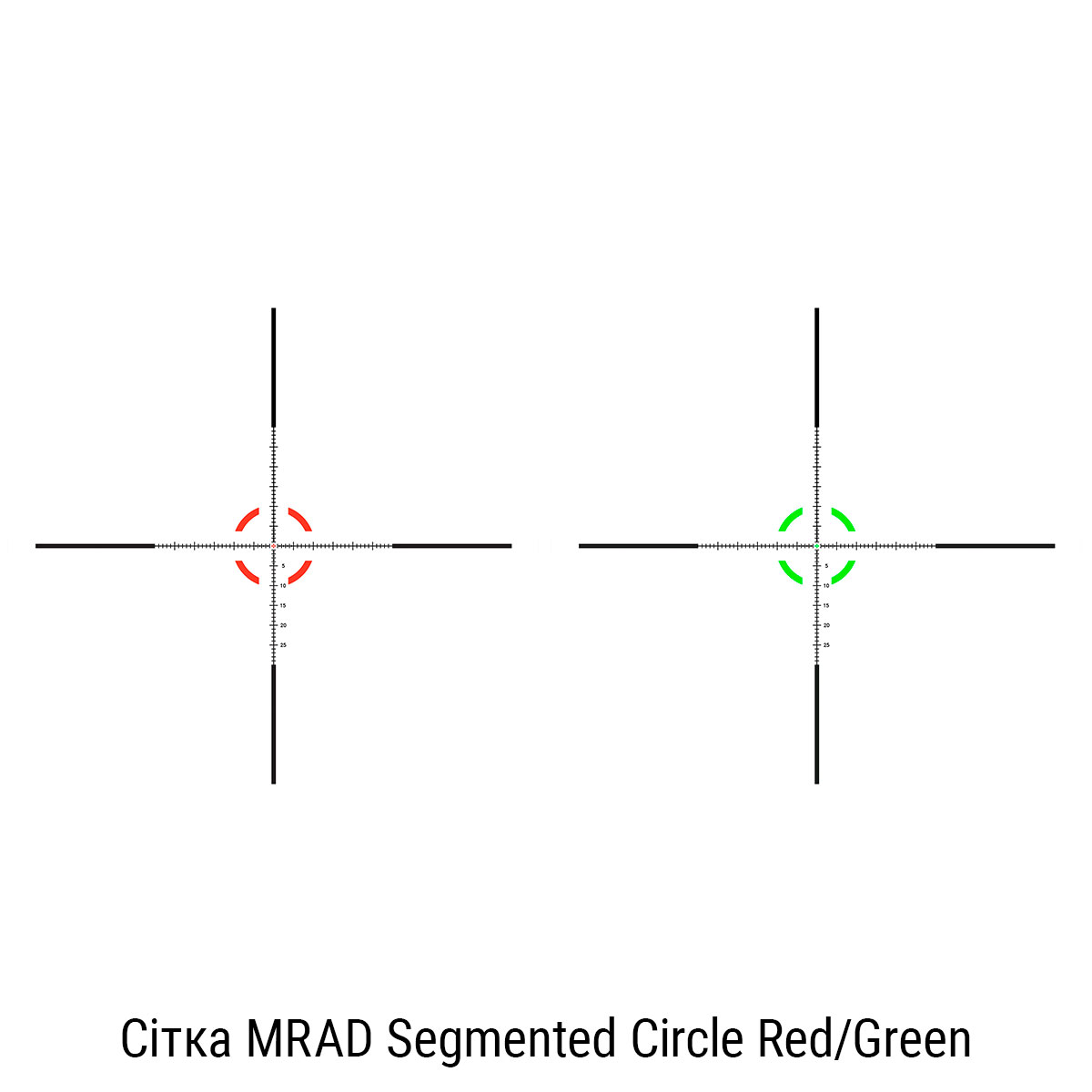 Прицільна сітка MRAD Segmented Circle Red/Green виконана у вигляді перехрестя, яке має додаткові мітки, та часткового кола, яке складається з 4 частин, кожна з яких віддалена від перехрестя та не перетинає його. Центральна точка, маленьке перехрестя біля точки та сегменти кола мають 10 режимів яскравості з можливістю вимкнення у проміжних значеннях. Джерелом живлення підсвітки виступає батарейка CR2032, яка входить до комплектації оптики.
