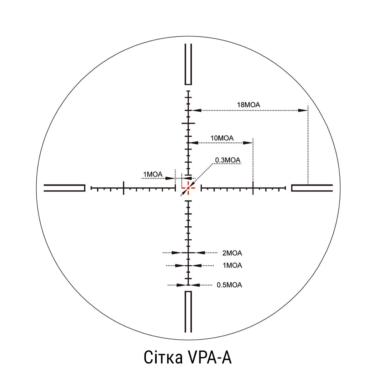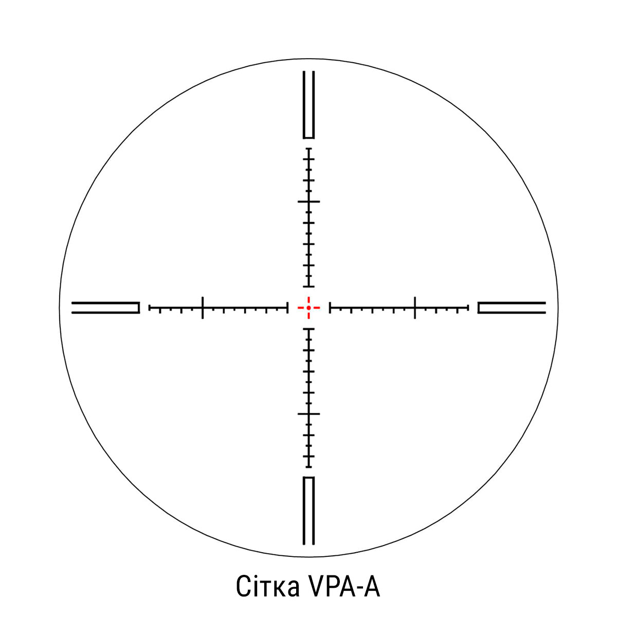 Vector Optics Aston 5-30x56 (VPA-A IR) – це потужний оптичний приціл з регульованим збільшенням від 5х до 30х, великим та світлосильним об'єктивом 56 мм та прицільною сіткою VPA-A у вигляді перехрестя, яка розміщена у другій фокальній площині та має червоне регульоване підсвічуванням.