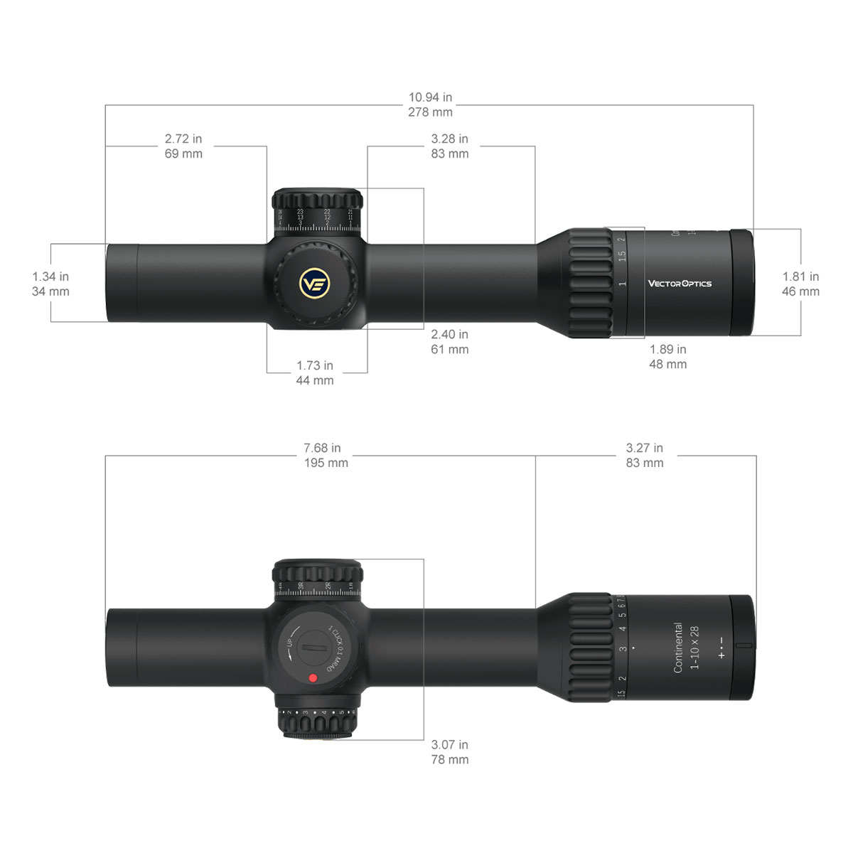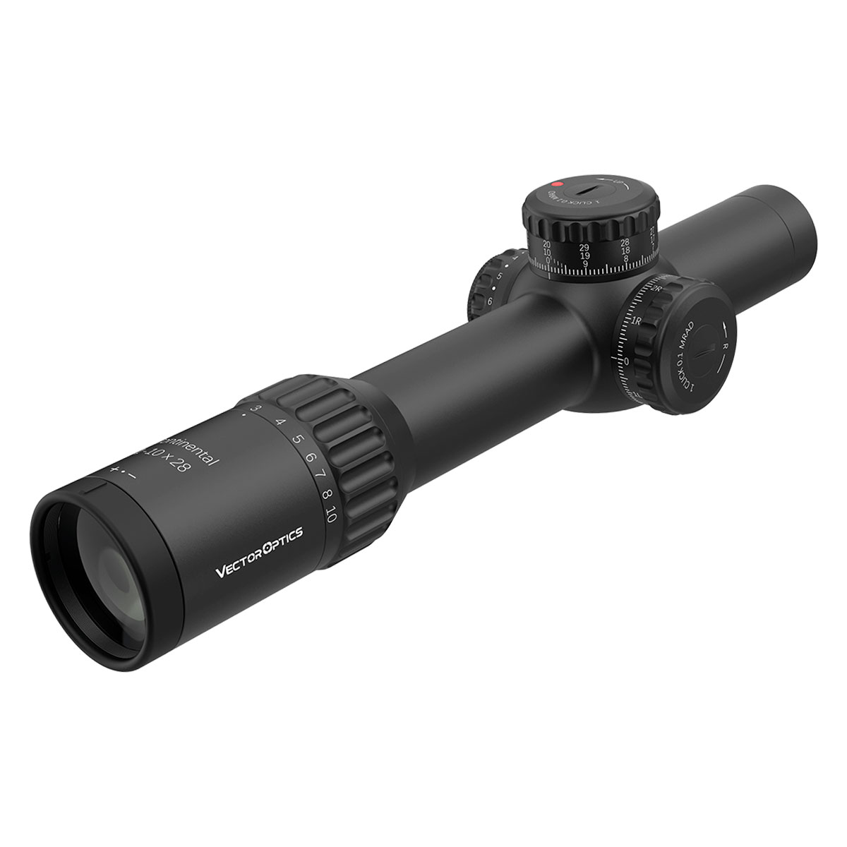 Vector Optics Continental 1-10x28 ED (FFP, VET-CTR IR, 34 мм) – це високоякісний та міцний оптичний приціл з потужним регульованим збільшенням від 1x до 10x. Він має світлосильний об'єктив 28 мм, балістичну прицільну сітку VEC-MBR у першій фокальній площині з червоним регульованим підсвічуванням та 34-міліметровий діаметр трубки.
