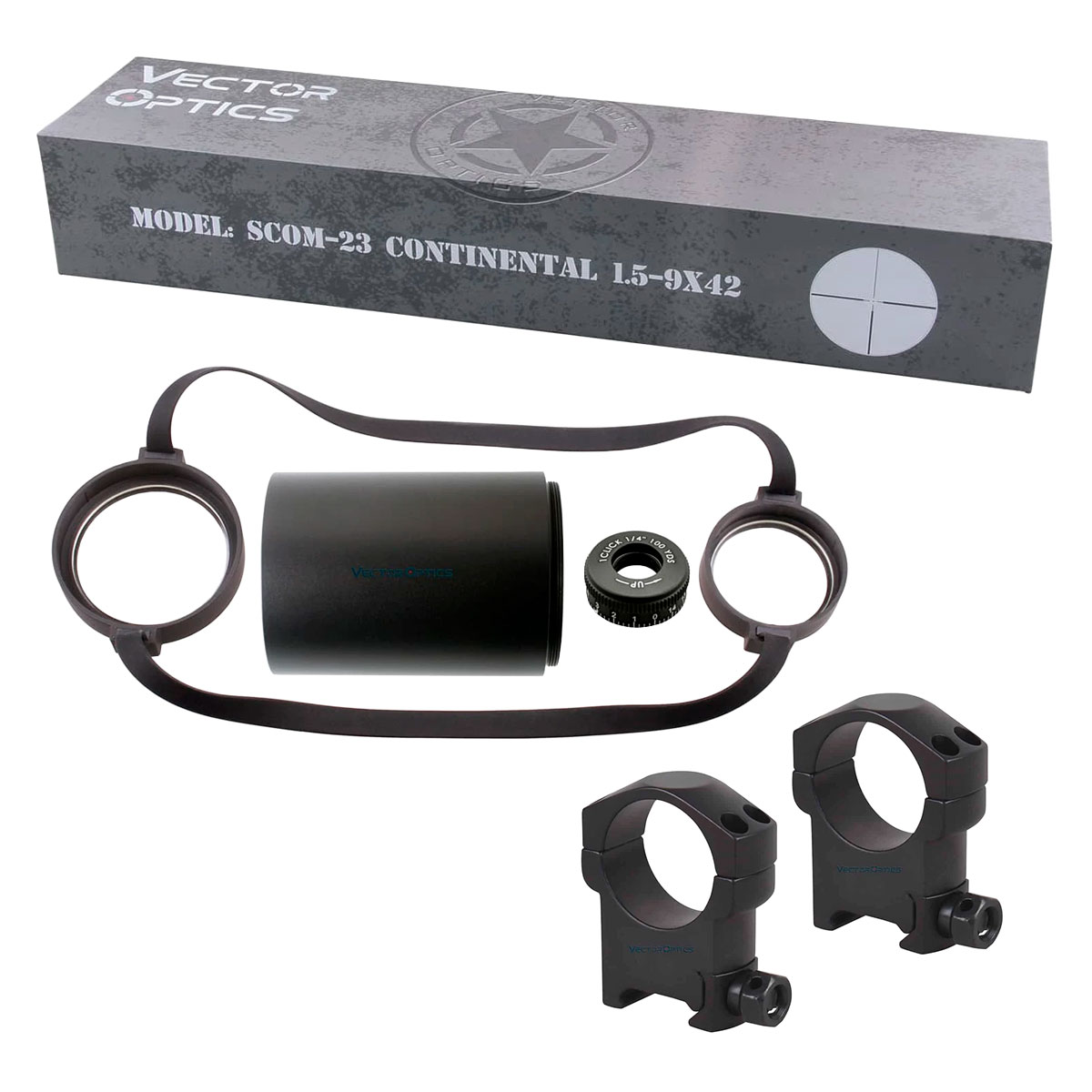 Vector Optics Continental 1.5-9x42 (SFP, G4 IR, 30 мм) – це міцний та якісний оптичний приціл з потужним регульованим збільшенням від 5х до 30х. Він має великий та світлосильний об'єктив 56 мм, балістичну прицільну сітку VCT-20A у другій фокальній площині з червоним регульованим підсвічуванням та 30-міліметровй діаметр трубки.