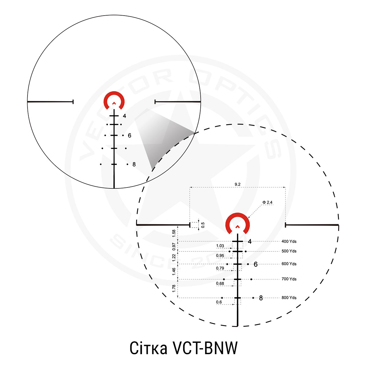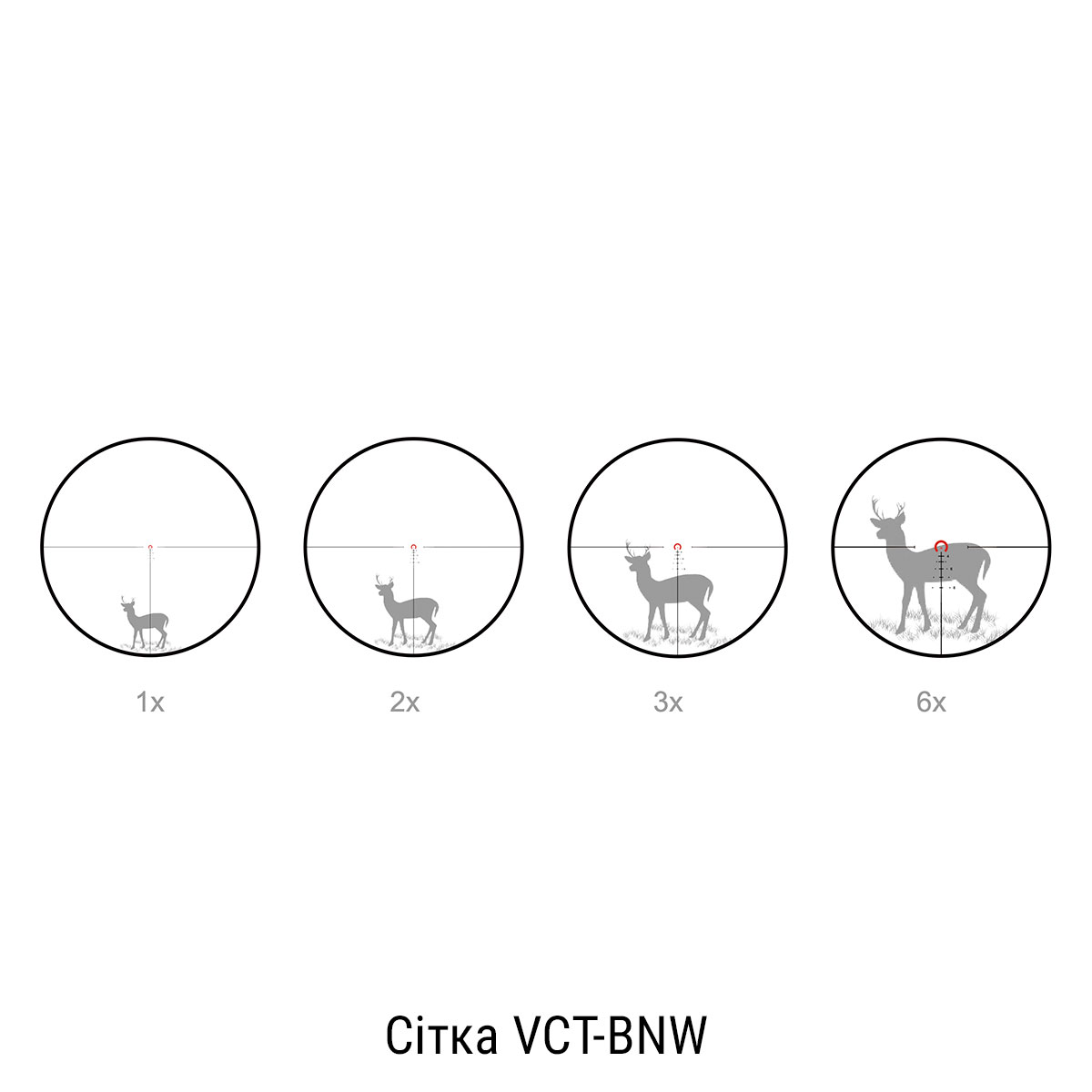 - Тип прицільної сітки: VCT-BNW (травлене скло)