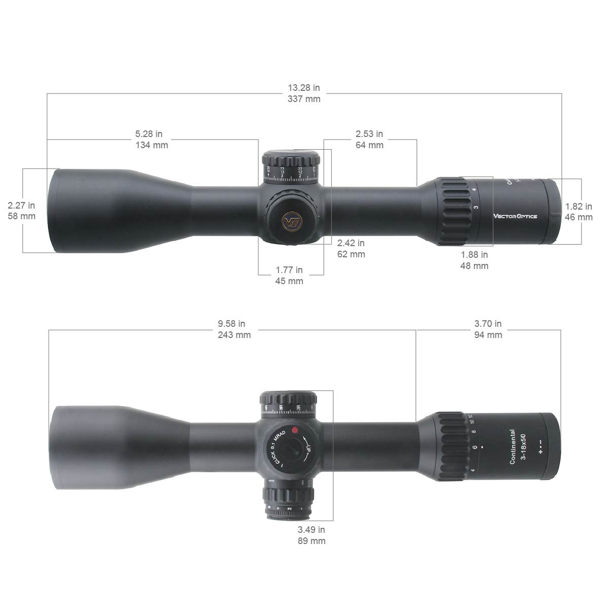 Vector Optics Continental 3-18x50 — оптичний приціл, розробленим для найвимогливіших стрільців, які прагнуть до безкомпромісної оптичної та функціональної переваги. Цей приціл ідеально підходить для високоточної стрільби на середні та дальні дистанції, тактичного застосування та полювання в складних умовах. Універсальний діапазон збільшення від 3x до 18x дозволяє ефективно працювати по цілях на різних відстанях, а великий 50-міліметровий об'єктив гарантує чудове збирання світла. Всі лінзи мають повне багатошарове просвітлення (Fully Multi-coated), а мінімальна дистанція фокусування від 9 метрів розширює сферу його застосування.