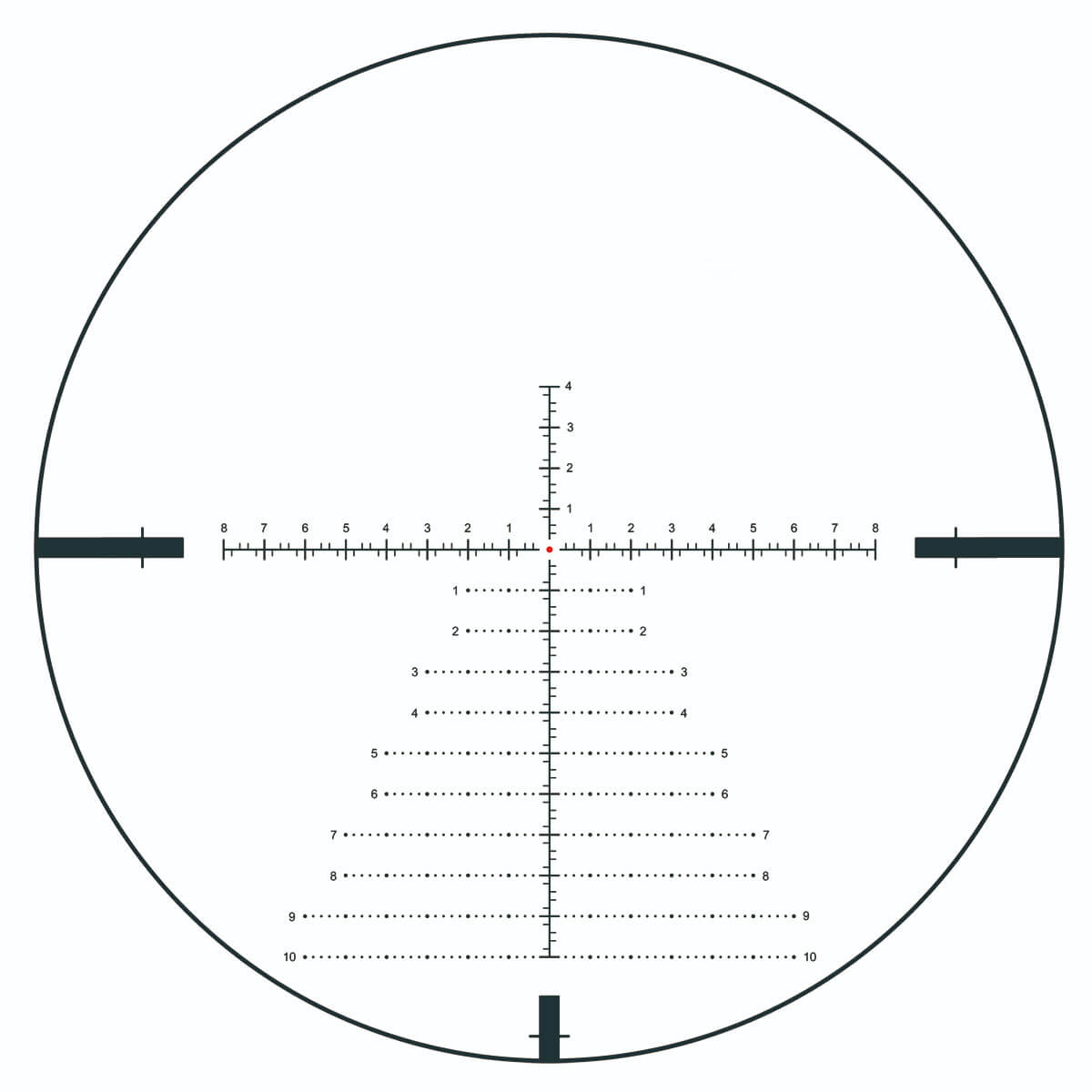 Діапазон регулювання поправок по вертикалі складає 44 MIL, а по горизонталі – 16 MIL. Ціна одного кліку тактичних барабанів становить 1/10 MIL, забезпечуючи точне та інтуїтивно зрозуміле налаштування. Барабани оснащені функціями Turret Lock (блокування від випадкового зміщення) та Zero Stop (швидке повернення до пристрілювального нуля), які є важливими для тактичної та спортивної стрільби. Передбачена корекція діоптрій в діапазоні від -3 до +2. Прицільна сітка VCT-34 має 6 рівнів підсвічування, що живиться від батарейки CR2032.