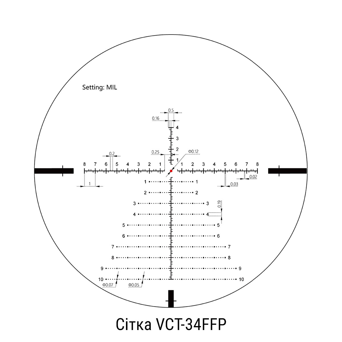- Тип прицільної сітки: VCT-34FFP (травлене скло)