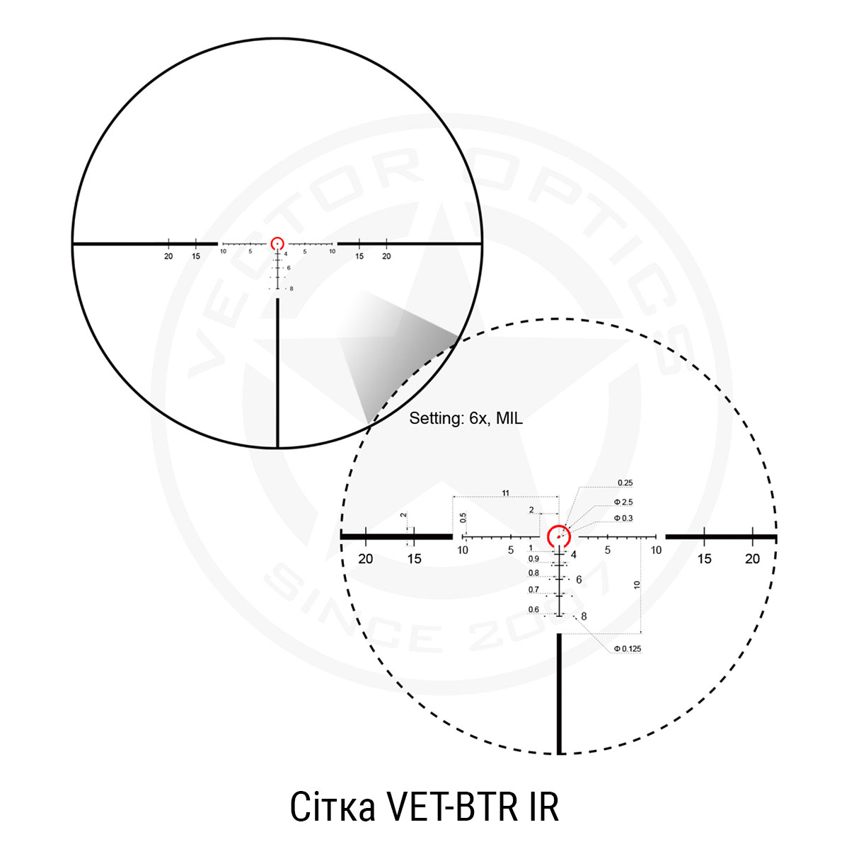 Vector Optics Continental x6 1-6x24 Tactical (SFP, VET-BTR IR, 30 мм) – це ширококутний (23° при 1х) приціл загінного типу, який може встановлюватися на карабіни різного типу. Має балістичну прицільну сітку VET-BTR для швидкого і точного наведення на ціль. Сітка розміщена у другій фокальній площині, має підсвічування червоного кольору з 6 рівнями яскравості.