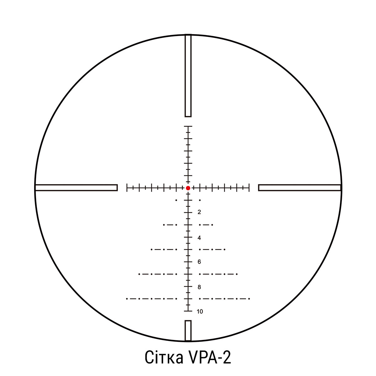 Оптичний приціл Vector Optics Paragon 6-30x56 GenII (VPA-2 IR) має великий світлосильний об'єктив 56 мм, регульоване оптичне збільшення у межах від 6х до 30х та балістичну прицільну сітку VPA-2 у другій фокальній площині з підсвічуванням центральної точки.
