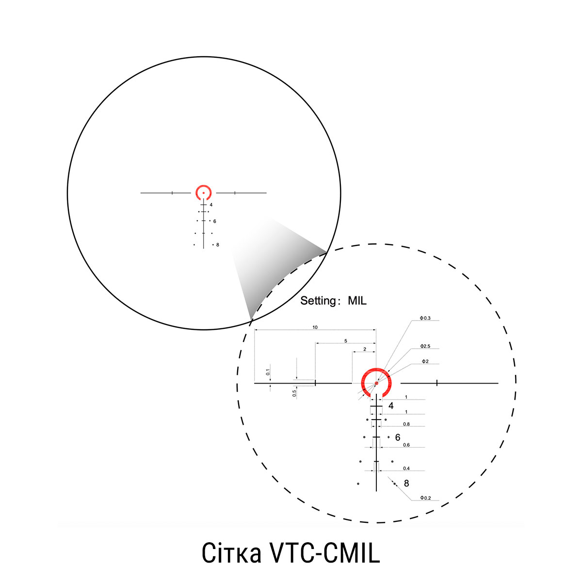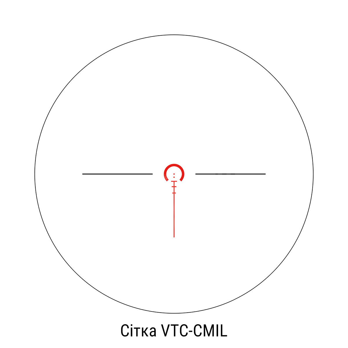 Vector Optics Taurus 1-6x24 (VTC-CMIL IR) – ширококутний приціл-загінник з регульованим збільшенням від 1х до 6х та об'єктивом 24 мм. Модель вирізняється прицільною сіткою VTC-CMIL з функцію підсвічування та регулювання ступенів інтенсивності для комфортної роботи в умовах обмеженого бачення як на близьких, так і на середніх відстанях.
