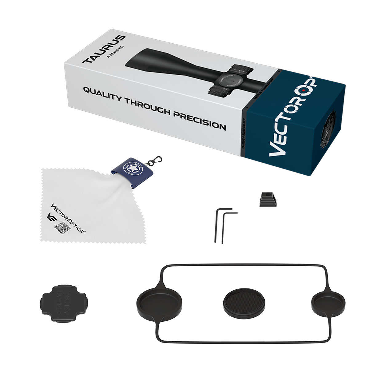 Комплектація Vector Optics Taurus 4-32x56 ED VTA-6 MIL включає кільця (2 шт.) для кріплення на планку Weaver/Picatinny, щоб відразу із коробки роботи перші постріли. Також до комплектації входять захисні кришки для окуляра і об'єктива, знімний важіль зміни кратності та шестигранний ключ.