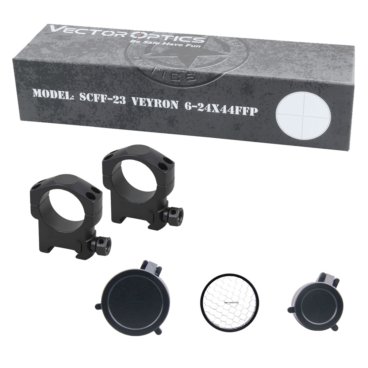 У комплекті з прицілом Vector Optics Veyron 6-24x44 Etched glass MPR-4 додається значний перелік комплектуючих, серед яких: кришки об'єктива та окуляра на резинках, змінний важіль зміни кратністі, антивідблискова насадка на об'єктив і змінні барабани поправок з кільцям. Така комплектація якнайкраще забезпечить надійність користування прицілом і підійде для найвибагливіших користувачів.