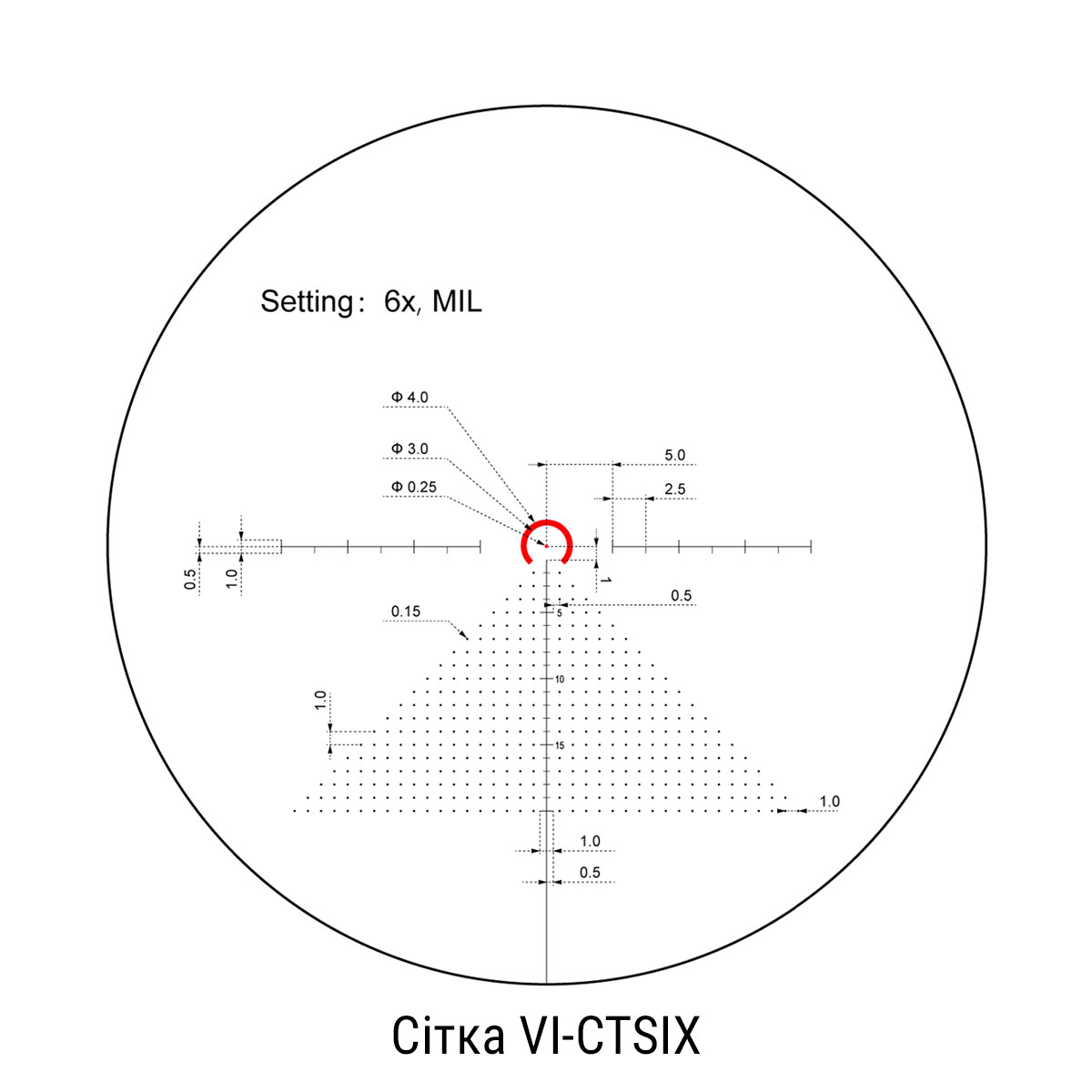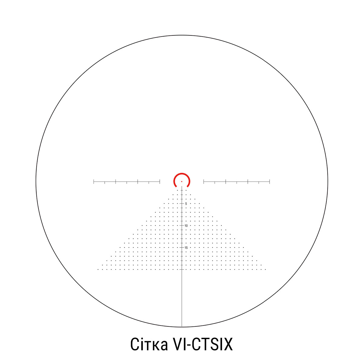 Victoptics (Vector Optics) S6 1-6x24 (VI-CTSIX IR) – це ширококутний загінний приціл з фіксованою заводською відстройкою паралакса на 91.4 м (100 ярдів), збільшенням від 1х до 6х та об'єктивом 24 мм. Виділяється прицільною сіткою VI-CTSIX, яка розташована у другій фокальній площині та має регульоване підсвічування червоного або зеленого кольору для комфортної стрільби в умовах низького освітлення або вночі.