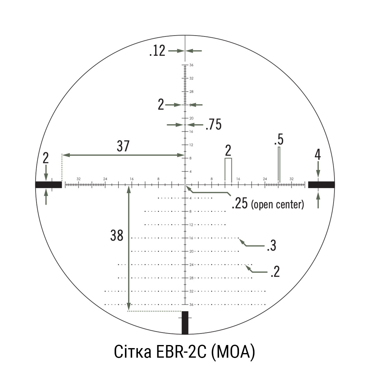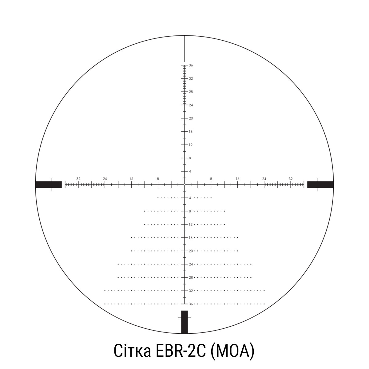 Вигравійована балістична прицільна сітка EBR-2C (MOA) розташована у першій фокальній площині. Це означає, що сітка масштабується при зміні кратності, тобто всі її елементи збільшуються пропорційно до зміни розмірів цілі. Таким чином, кутові розміри сітки залишаються вірними за будь-якого робочого збільшення. Також варто виділити зручну бокову відстройку паралакса (Side Focus) від 9.1 м і до нескінченності.