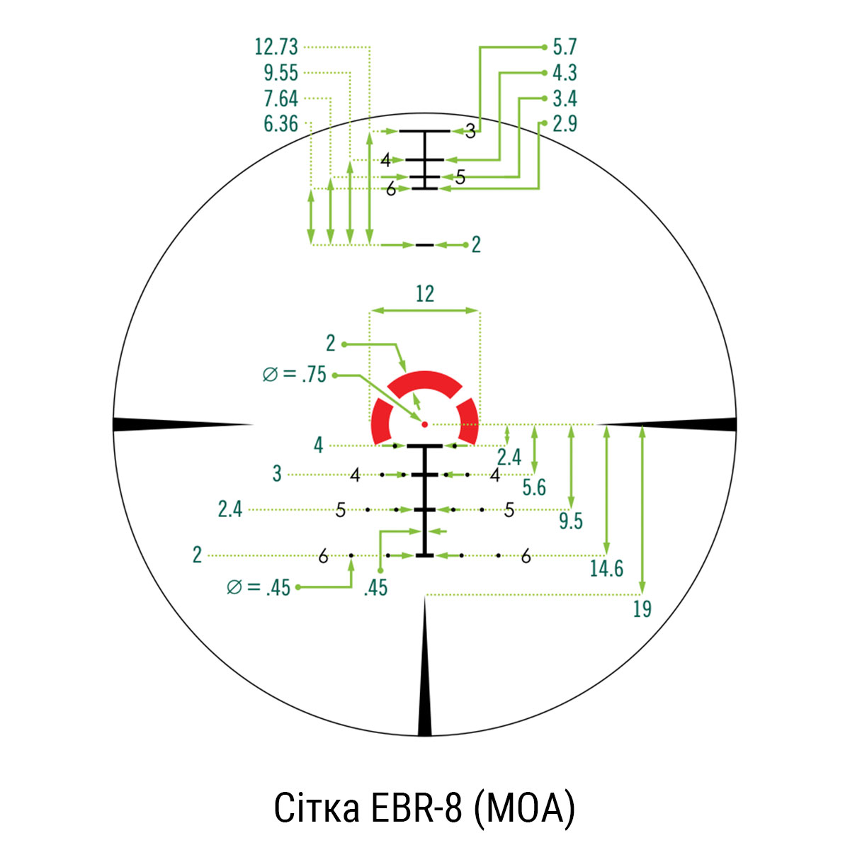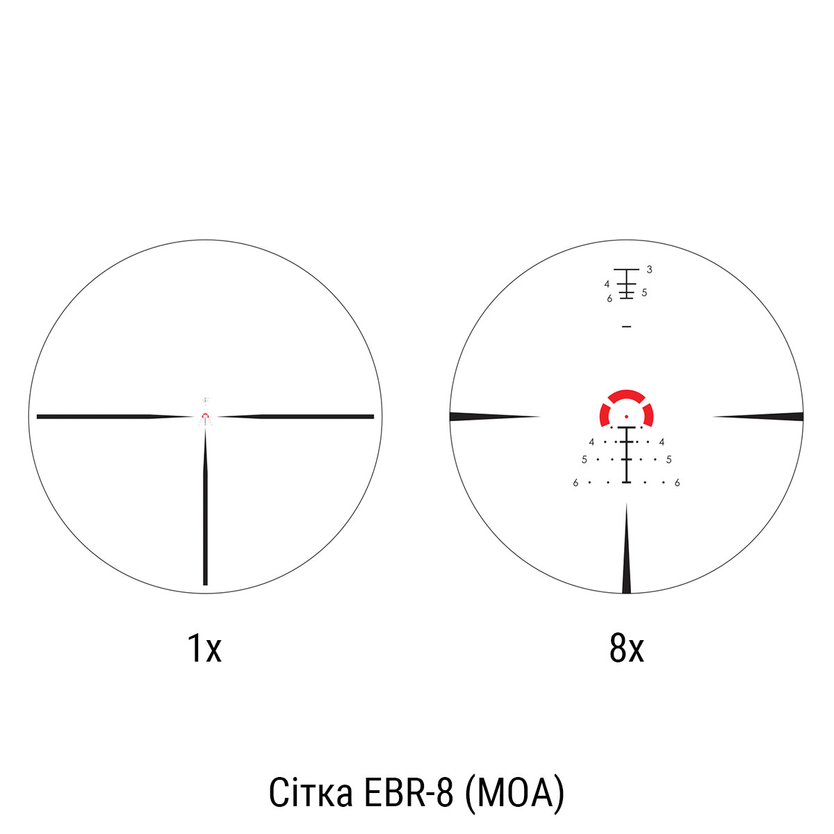 Оптичний приціл Vortex Strike Eagle 1-8x24 (FFP, EBR-8) виділяється прицільною сіткою EBR-8 з підсвічуванням, яка розташована в першій фокальній площині. Це означає, що кутові розміри сітки будуть вірні на будь-якому збільшенні. Це дозволяє зручно вираховувати дистанцію до цілі та завжди бути впевненим, що Ваш постріл буде максимально влучним.