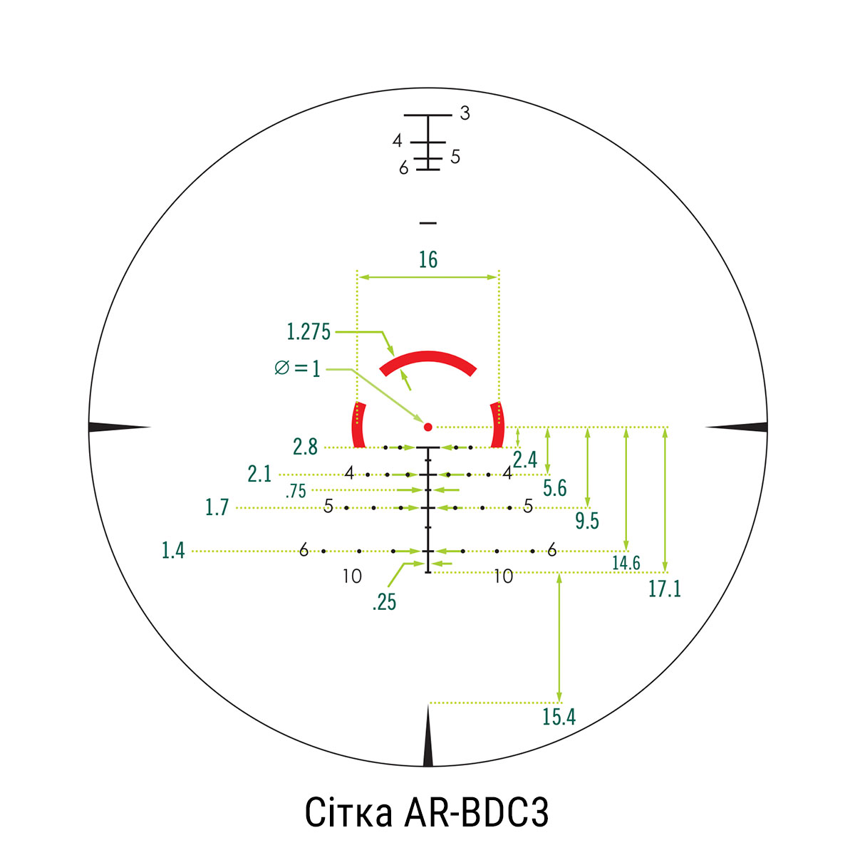 Балістична візирна сітка прицілу AR-BDC3 IR вигравійована на лінзі у другій фокальній площині об'єктива. Відстройка паралакса виконана на заводі виробника на відстані 91 м (100 ярдів).