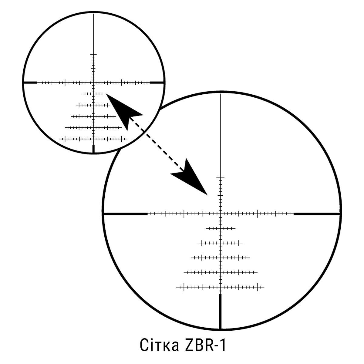 Приціл має зручну вигравійовану балістичну прицільну сітку ZBR-1 без підсвічування, яка розташована у другій фокальній площині. Також варто виділити зручну бокову відстройку паралакса (Side Focus) від 9.1 м і до нескінченності.