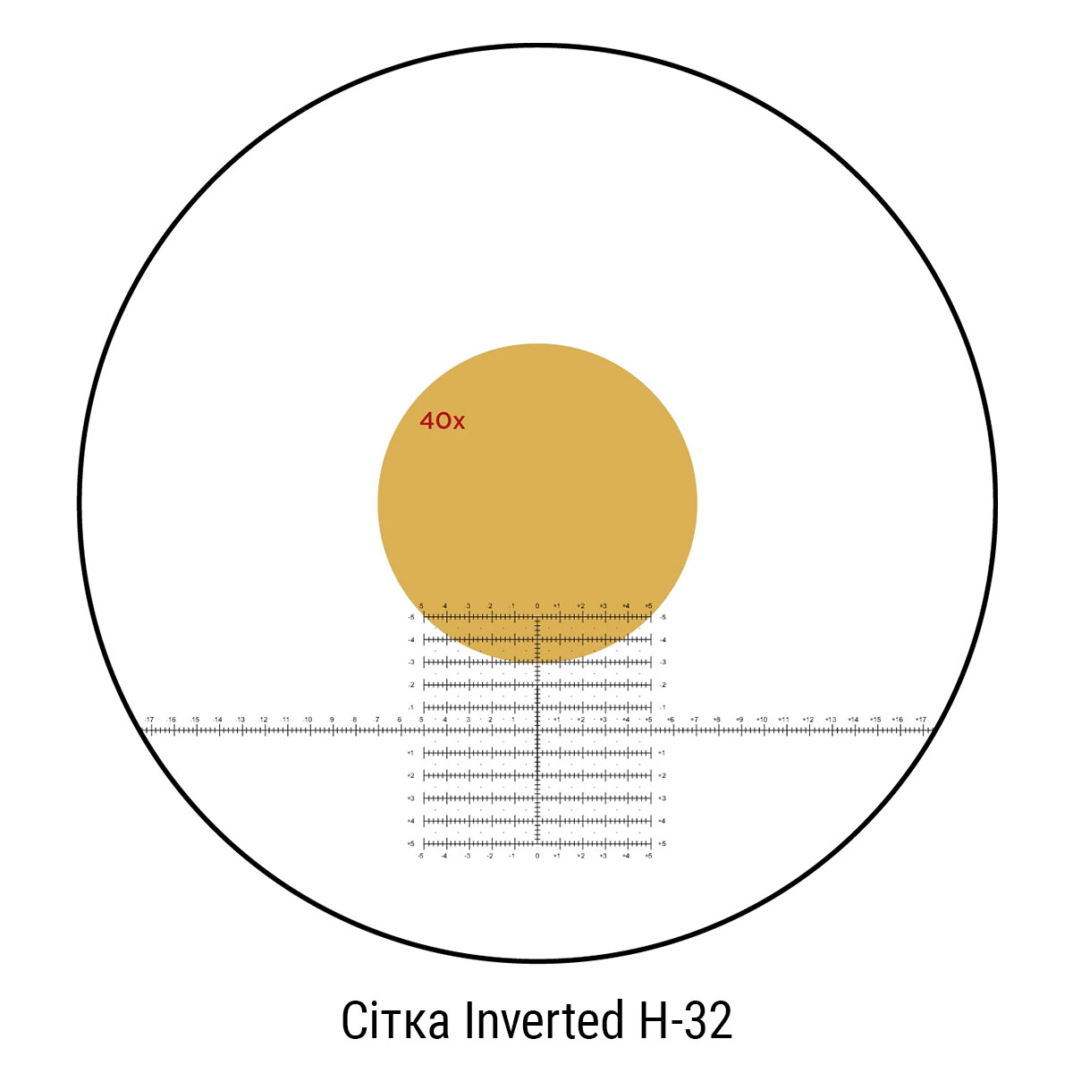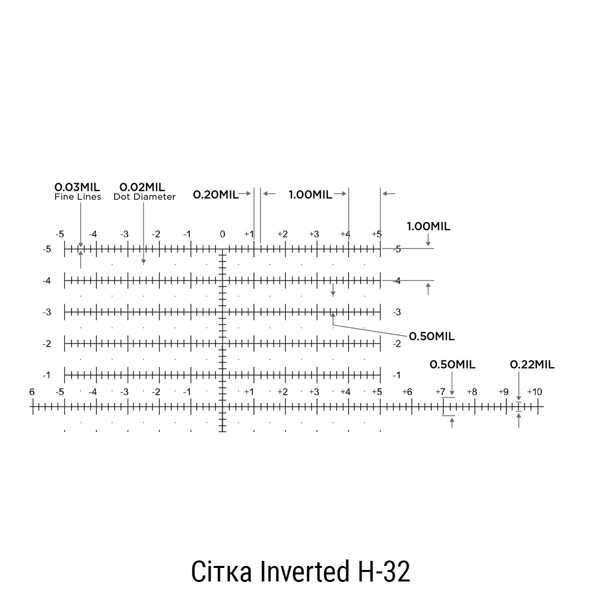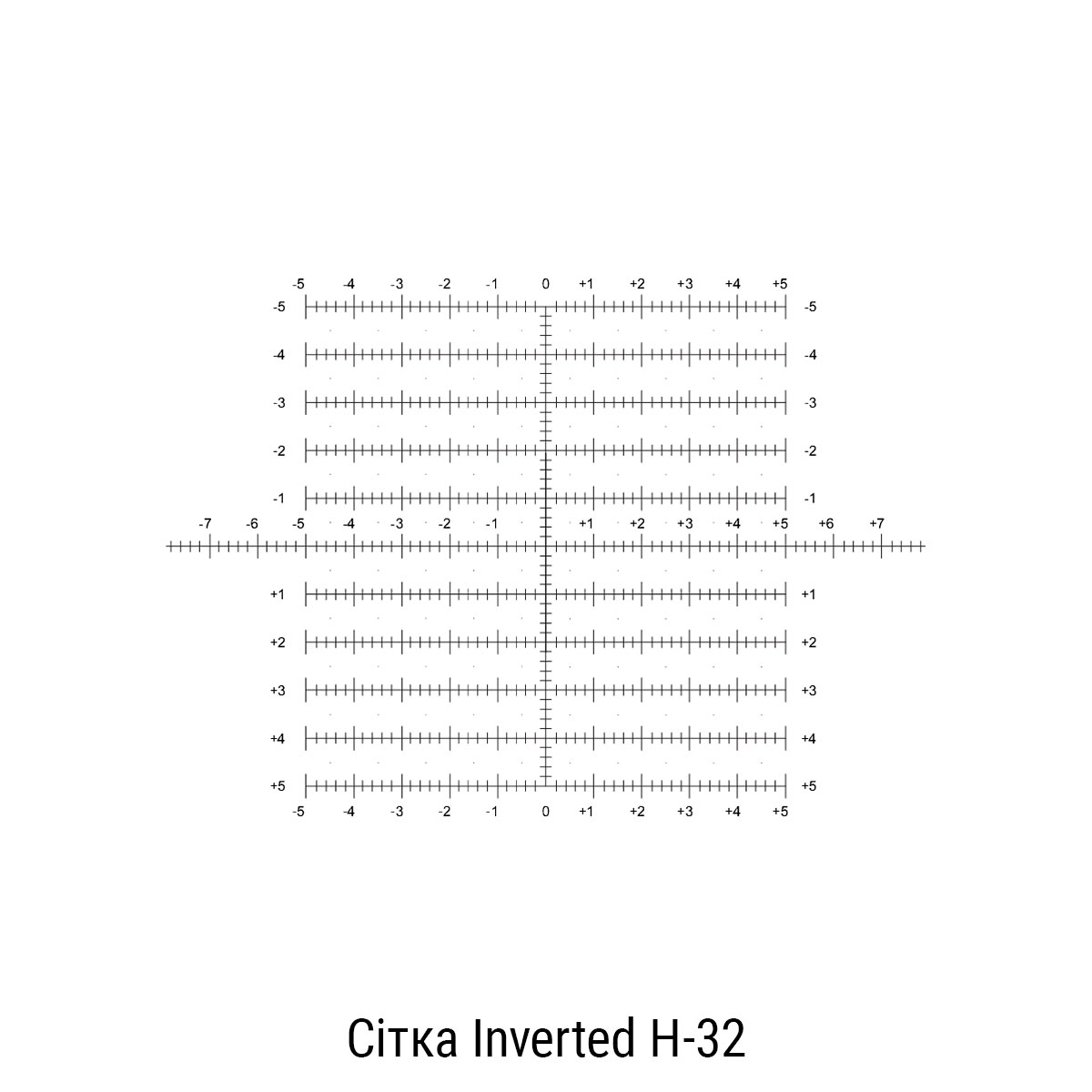 - Вбудована далекомірна сітка Inverted H-32 з ціною поділки 0.2 MIL