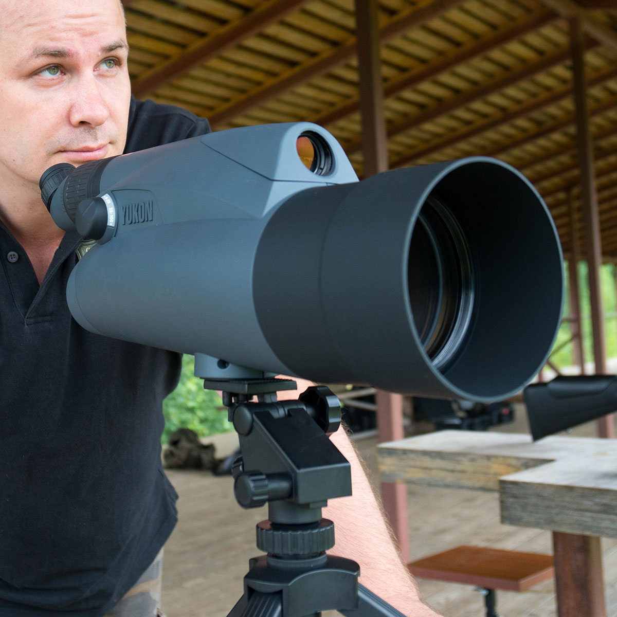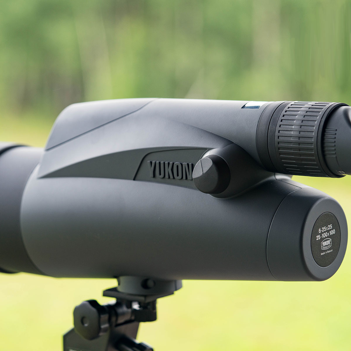 Окулярний вузол підзорної труби Yukon 6-100x100 нахилений під кутом 45° до оптичної осі та вільно обертається навколо неї на 360°. Така конструкція дозволяє підібрати зручне положення під час спостереження зі штатива будь-якої висоти. У комплект даної моделі входить простий настільний штатив: стійкий, але з пластиковими напрямними та гвинтами. Для спостереження з балкона його цілком достатньо, але для роботи на відкритому просторі краще придбати професійний повнорозмірний фотоштатив з кріпленням 1/4" або 3/8".