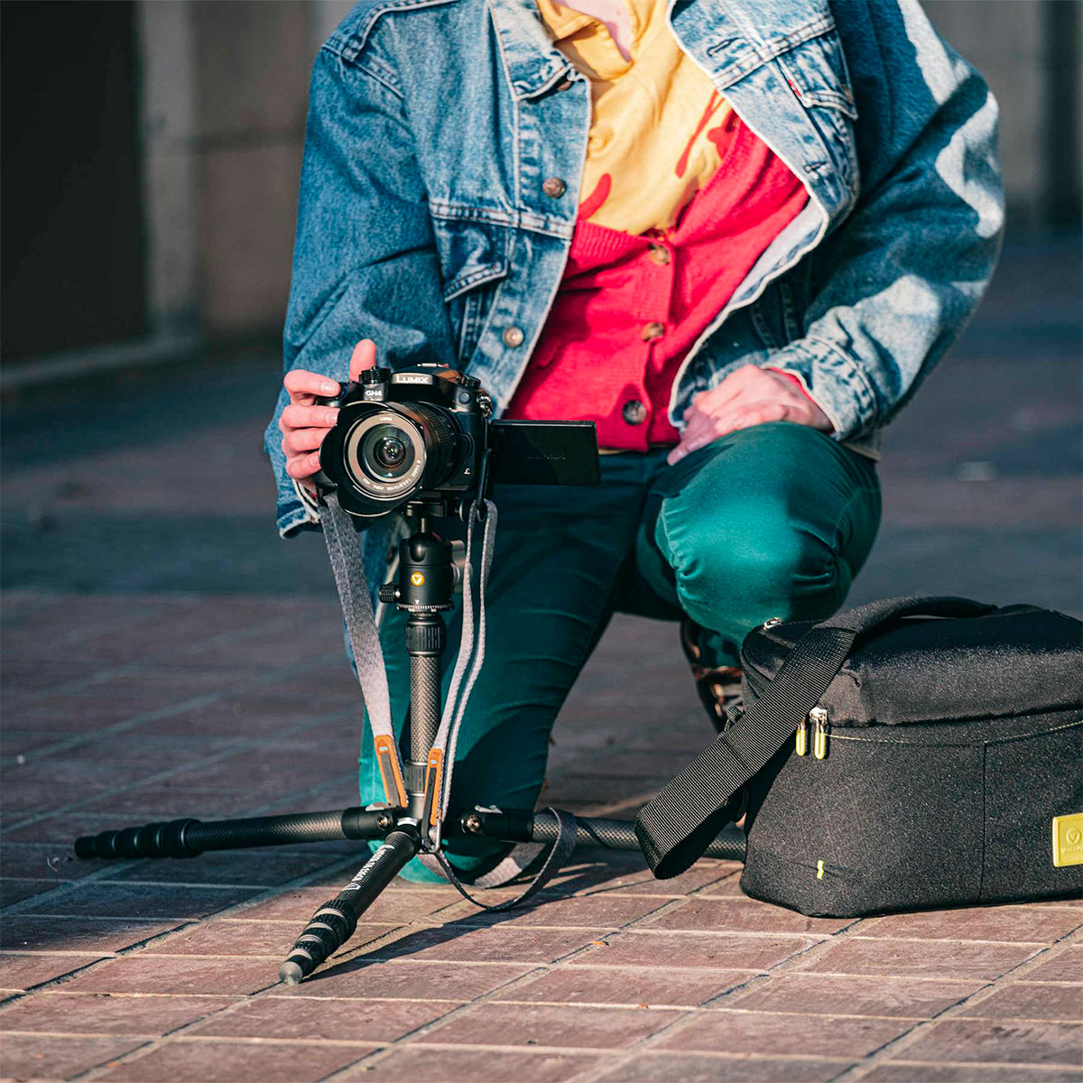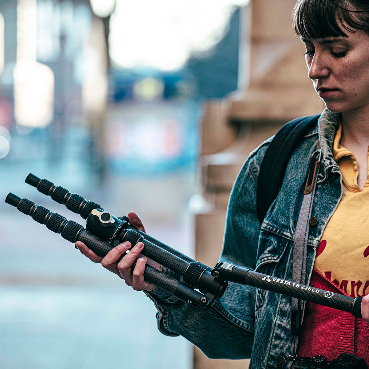 Моделі Vesta TB мають надійні замки телескопічних секцій ніжок Quick-twist Lock, що швидко фіксуються. Важливо відзначити, що замки розбірні і розроблені таким чином, щоб їх було легко очистити від бруду, пилу і піску навіть після зйомок на пляжі. Для макрозйомки з низького кута штатив має три кути нахилу ніжок (21°, 50° і 80°) і оснащений фіксатором, що дозволяє зняти центральну колону і опуститися до мінімальної робочої висоти. Крім того, заощаджуючи час, Ви можете просто перевернути центральну колону донизу, і використовувати штатив для макрозйомки.