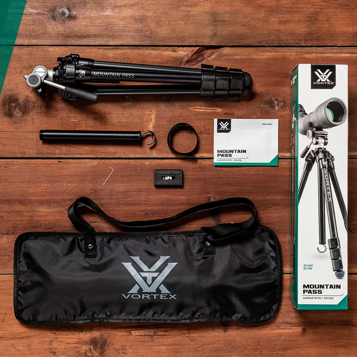 Vortex Mountain Pass Tripod Kit – це легкий та універсальний алюмінієвий штатив, який може витримувати навантаження до 10 кг та чудово підійде для тривалих статичних спостережень через підзорну трубу і великий бінокль або для зйомок з фотоапарата чи відеокамери.