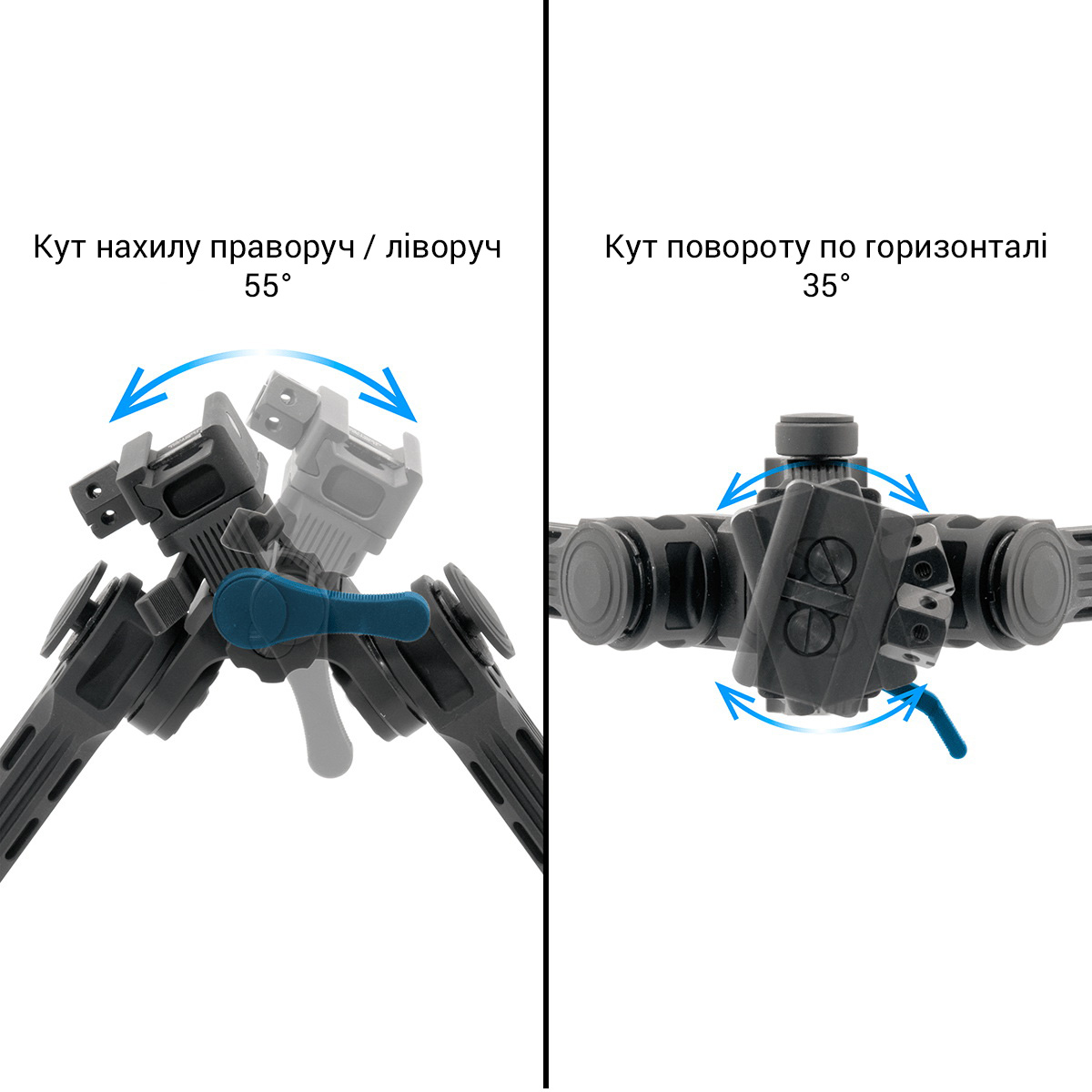 Окремої уваги заслуговує механізм регулювання положення зброї. Сошка Leapers UTG Big Bore Full Stability забезпечує обертання по горизонталі в межах 35° та нахил праворуч/ліворуч до 55°. Це надає стрільцю широкі можливості для точного налаштування положення зброї без необхідності зміни положення самого стрільця чи перевстановлення зброї.