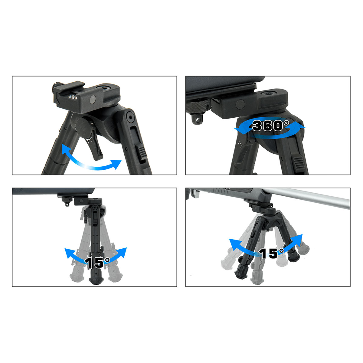 • платформа 360° • регулювання довжини ніжок • регулювання кута ніжок • регулювання кута пострілу • шарнірна база |