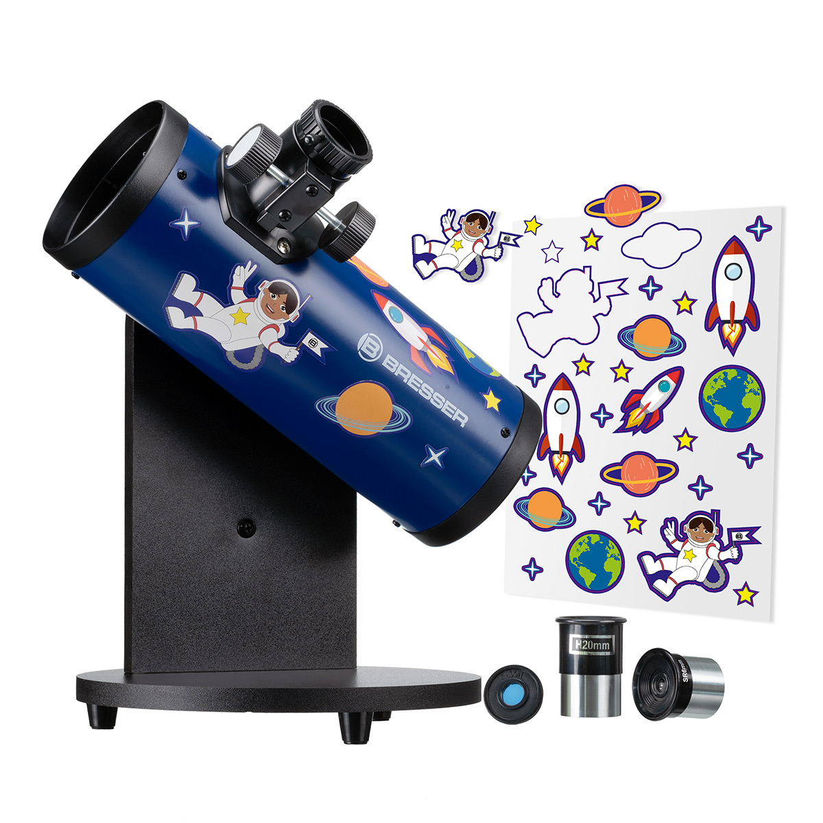 Збільшення можна регулювати за допомогою двох окулярів, що входять до комплекту постачання. Окуляри 20 мм і 6 мм забезпечують 15-кратне і 50-кратне збільшення, відповідно. Крім того, в комплекті з телескопом поставляється місячний фільтр, який захищає очі від яскравого світла при спостереженні пейзажів нашого супутника. А веселі наліпки Bresser Family, допоможуть створити власний дизайн оптичного приладу.