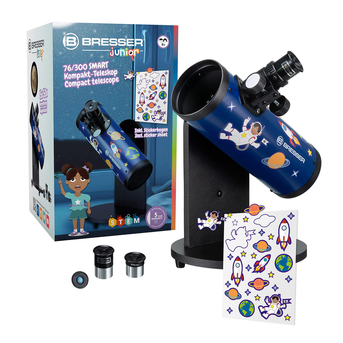 Телескоп Bresser Junior 76/300 Smart – легкий і компактний рефлектор на популярному монтуванні Добсона. Модель досить проста в експлуатації та орієнтована на юних любителів астрономії віком від 8 років.