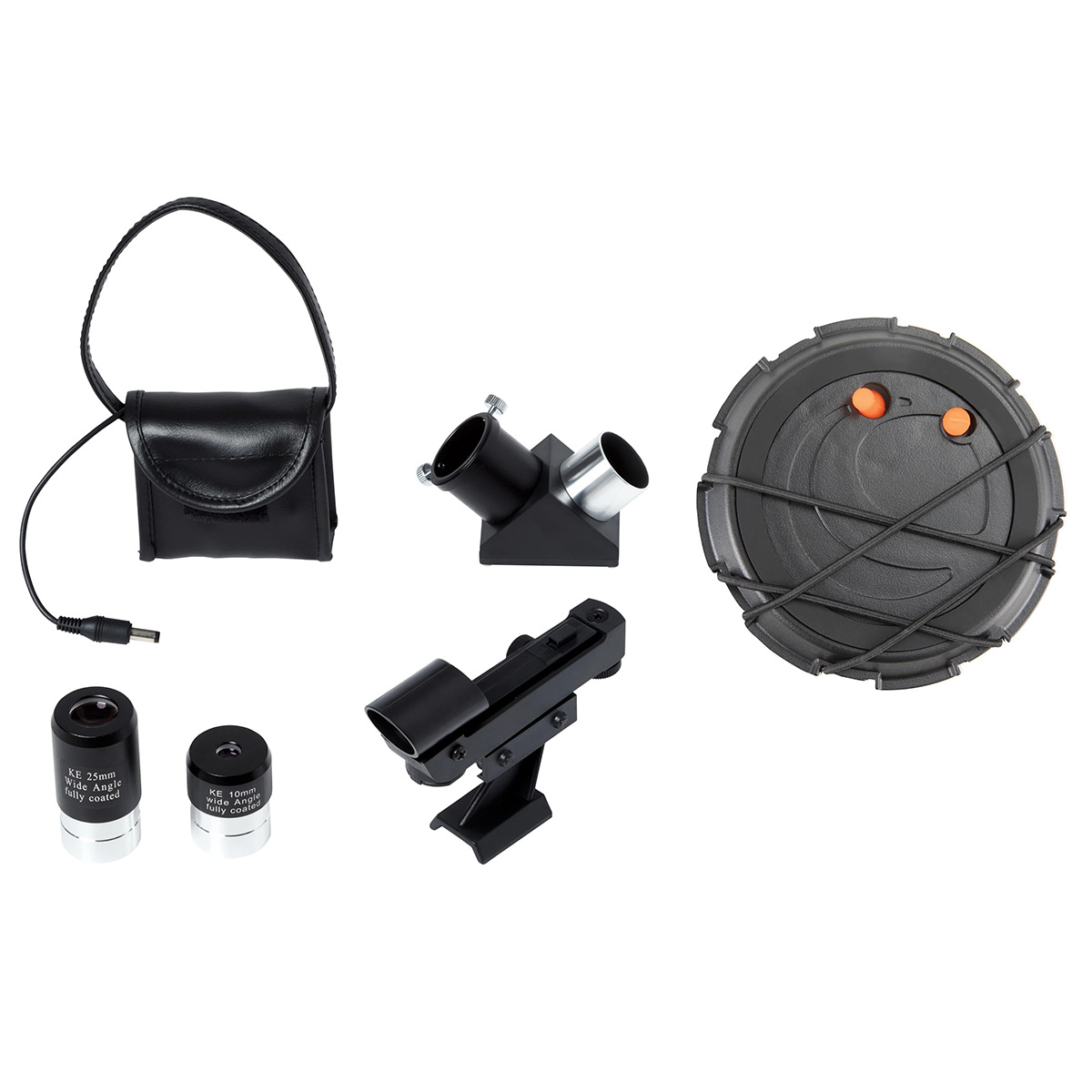 На додачу Celestron Astro Fi 90 комплектується якісними аксесуарами та програмою-планетарієм Starry Night, яка дивує інформативністю та візуальними ефектами. До комплекту постачання входять два окуляри (25 мм і 10 мм), діагональне дзеркало 90°, шукач StarPointer та корисне доповнення — захисна кришка для об'єктива, яка також виконує функцію адаптера для смартфона. Цей аксесуар дозволяє підключити практично будь-який телефон до будь-якого окуляра телескопа із зовнішнім діаметром 45 мм і менше. Адаптер легко встановлюється поверх окуляра, а еластичні шнури надійно утримують смартфон в потрібному положенні, що дозволяє робити якісні фото або відео.
