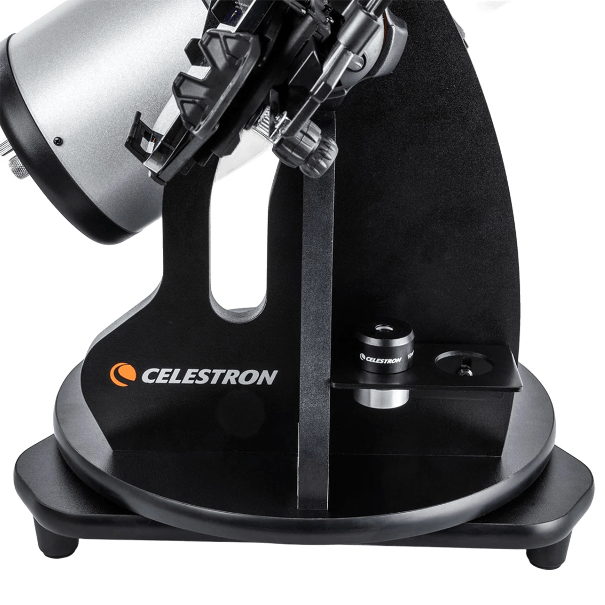 Монтування Добсона забезпечує просте й інтуїтивно зрозуміле керування телескопом, стабільну та надійну опору для оптичної труби. Воно компактне, легке та зручне для транспортування, що робить телескоп ідеальним для виїзних спостережень. Низький профіль полегшує доступ до окуляра в положенні сидячи або для дітей, а за потреби монтування можна розмістити на столі чи капоті автомобіля або навіть встановити на додатковий штатив для ще більшої гнучкості у виборі висоти. Монтування оснащене тефлоновими підшипниками, які забезпечують плавний рух по висоті та горизонталі. Інтегрована система регулювання натягу по осі висоти гарантує максимально комфортне й точне наведення. Тримач оптичної труби дозволяє регулювати її положення для зручного доступу до окуляра, а підставка для додаткових окулярів допомагає тримати їх під рукою під час спостережень.