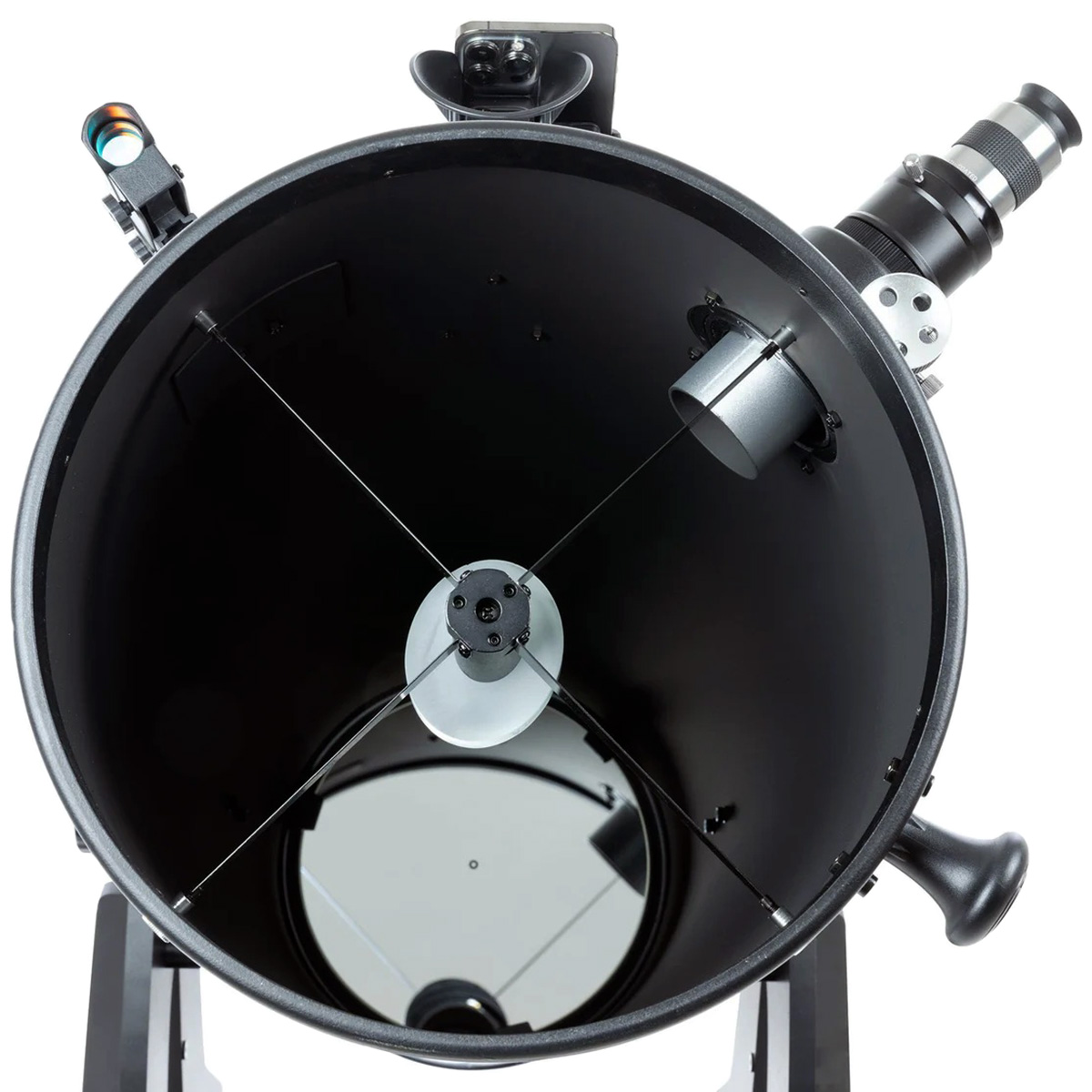 Оптична труба телескопа виготовлена зі сталі, а її внутрішня поверхня ретельно зачорнена для ефективного усунення небажаних відблисків і підвищення контрасту зображення. Головне дзеркало параболічної форми коригує сферичні аберації, а вторинне дзеркало закріплене на чотирьох тонких розтяжках для зменшення дифракційних ефектів і максимального збереження світлового потоку. Обидва дзеркала виготовлені з оптичного скла з низьким коефіцієнтом теплового розширення (аналог Pyrex), що сприяє стабільній якості зображення при змінних температурних умовах. Усі дзеркальні поверхні покриті фірмовими покриттями XLT із шарами діоксиду кремнію та пентаоксиду танталу, які підвищують відбивну здатність та загальну яскравість зображення. Ергономічна ручка панорамування на оптичній трубі забезпечує комфортне наведення телескопа без передачі тепла від рук до оптичної системи.