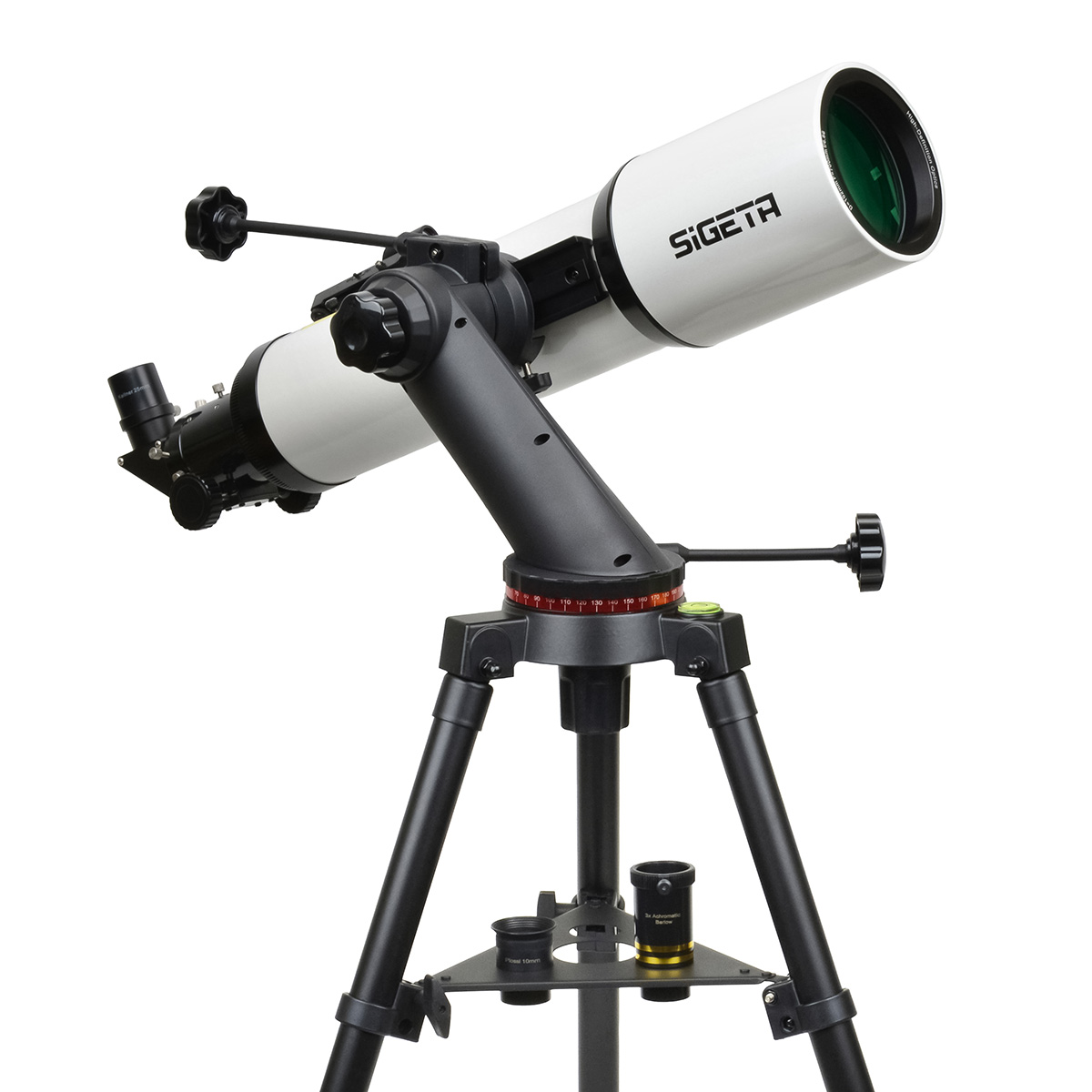 Телескоп SIGETA StarQuest 102/700 HD Air-Spaced Alt-AZ комплектується двома окулярами з посадковим діаметром 1.25" (31.7 мм): Kellner 25 мм для широкого поля зору та малих збільшень (28x — ідеально для пошуку об'єктів та спостереження великих туманностей і скупчень) та Plossl 10 мм для середніх збільшень (70x — універсальне збільшення для більшості об'єктів). Лінза Барлоу 3x потроює фокусну відстань, забезпечуючи додаткові збільшення 84x та 210x для детального вивчення планет та подвійних зірок.