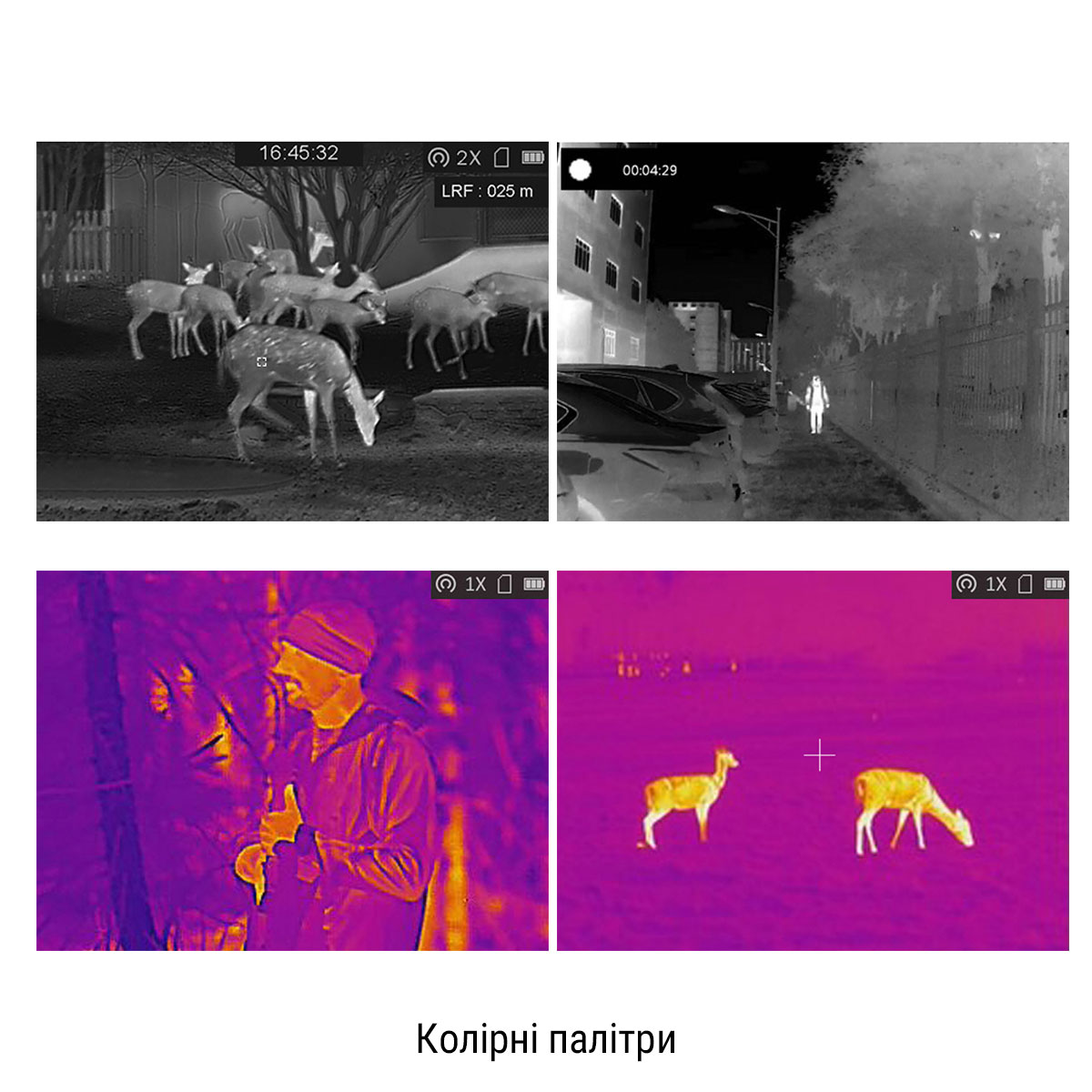 - Палітри кольорів: Black Hot, White Hot, Red Hot, Fusion, Visible, Image Fusion