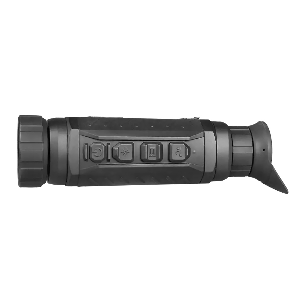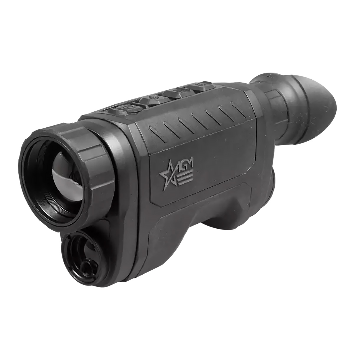 AGM ReachIR LRF 35-640 — ергономічний тепловізійний монокуляр преміумкласу від американського бренду, призначений для комфортних тривалих спостережень в ІЧ-спектрі з високою роздільною здатністю. Модель вирізняється міцним магнієвим корпусом з інтегрованим лазерним далекоміром, що передбачає професійне використання: полювання, охорона периметрів та кордонів, тактичні завдання тощо. 35-мм германієвий об'єктив з базовим оптичним збільшенням 2.0x забезпечує широке поле зору, яке становить 10.5° × 7.9 (гориз. x верт.). Лінійне поле зору на дистанції 100 метрів складає при цьому 21.9 м × 17.5 м, а дальність виявлення людини — 1800 метрів.