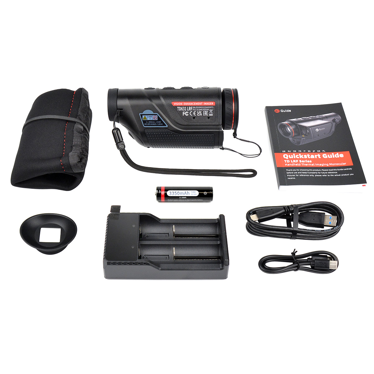 Guide TD631 LRF — тепловізійний монокуляр високої чіткості з інтегрованим лазерним далекоміром та цілевказівником, призначений для комфортних візуальних спостережень на протяжні відстані. Модель оснащено універсальним 35-мм об'єктивом із широким полем зору. Лінійне поле зору на 100 м по горизонталі та вертикалі становить відповідно 22.0 x 16.5 метрів. У парі з ним працює сучасна 12 µm тепловізійна матриця Guide Gen2 роздільною здатністю 640х480 пікселів. Дані оптико-електронні показники допоможуть ефективно впоратися з розпізнаванням та ідентифікацією віддалених джерел тепла, а також контролювати значний сектор огляду.