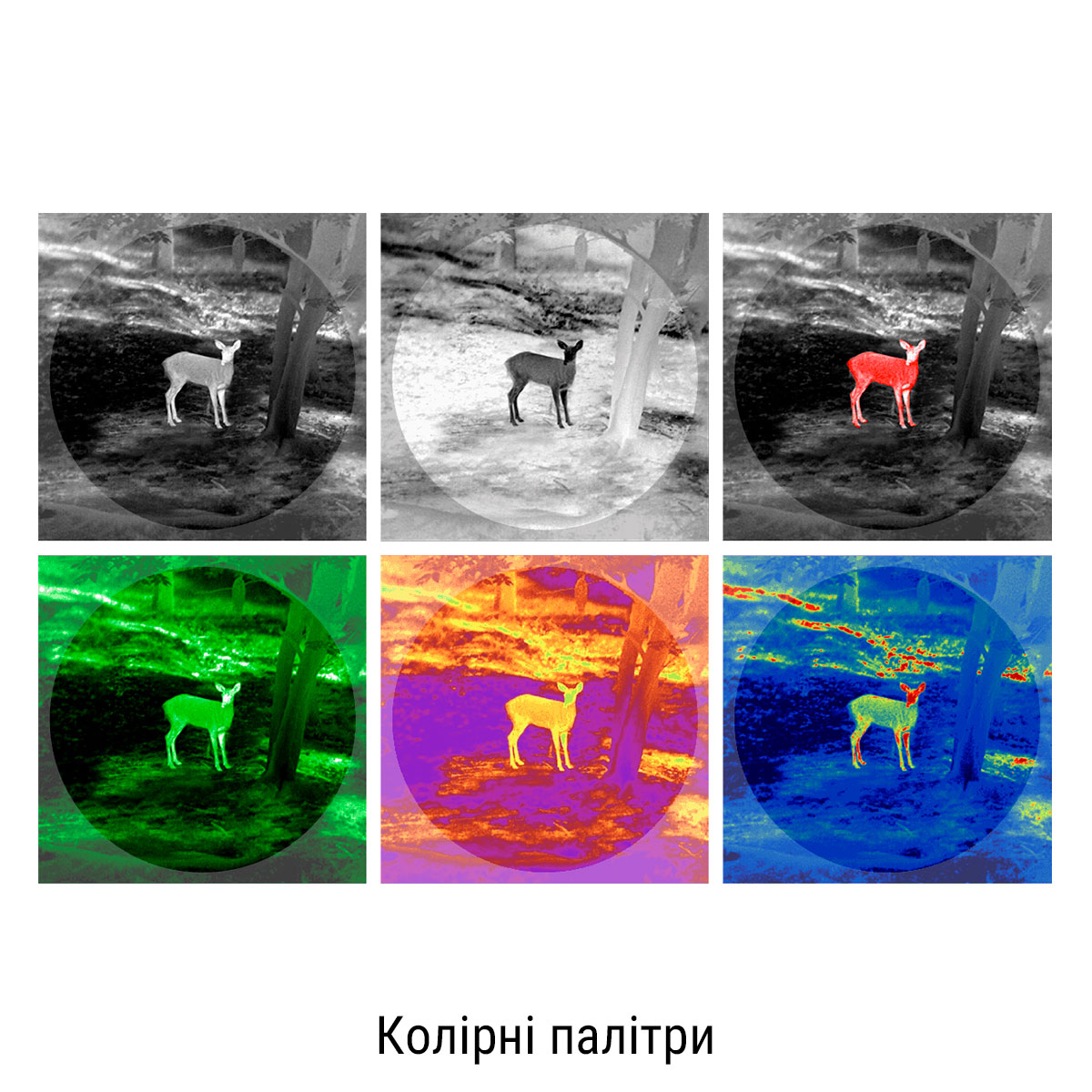 Для швидкої ідентифікації об'єкта доступно шість зручних палітр: Black Hot, White Hot, Adjustable Red Hot, Iron Red, Blue Hot, Green Hot. Користувач також має змогу швидко перемикати сюжетні режими (встановлені режими контрастності), що дозволить краще підлаштуватися під навколишні умови спостереження.