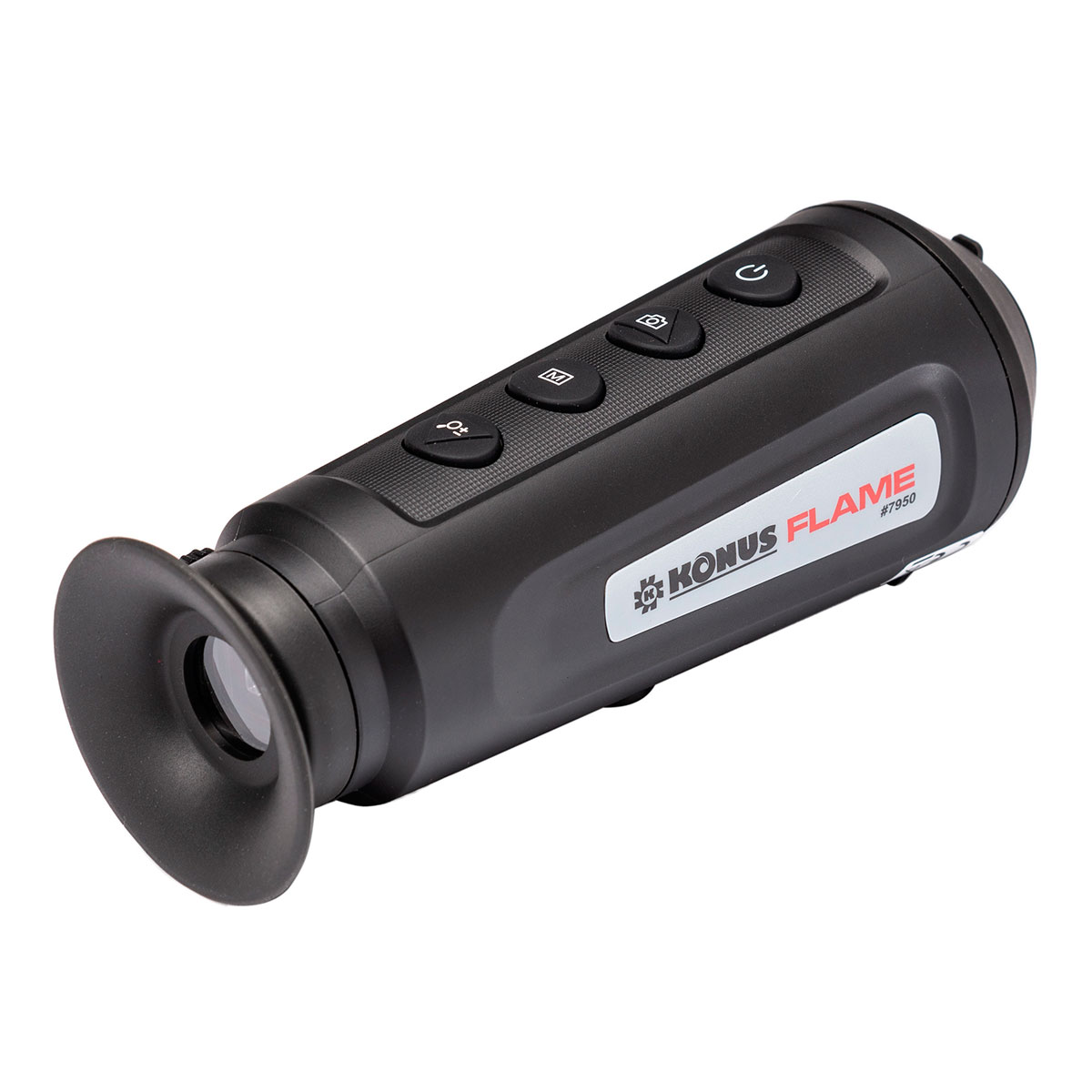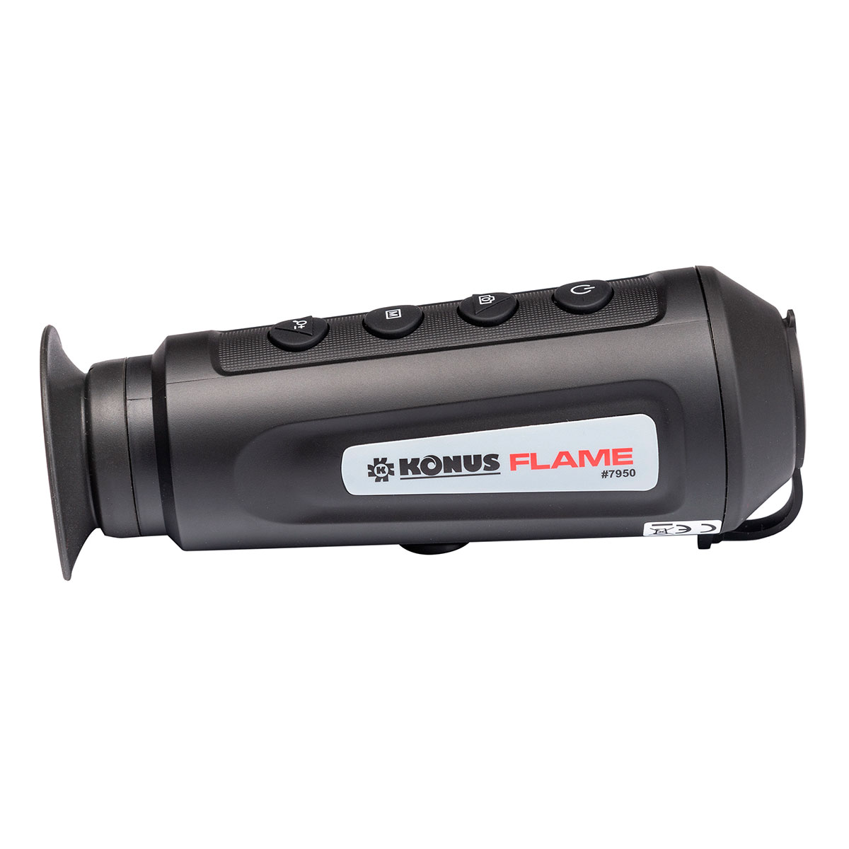 Konus FLAME 0.6x-2.4x — один з найдоступніших тепловізорів на ринку, який впорається з виявленням цілей на дистанціях до 559 метрів. Лінійне поле зору на 100 м по горизонталі та вертикалі становить відповідно 33.1 x 25.9 метрів. Модель виконана у вигляді тепловізійного монокуляра, що робить її універсальною в застосуванні. Маючи невеликі габарити і вагу, прилад може встановлюватися на тактичний шолом або штатив (не входить в комплект). Підходить для охорони, патрулювання, пошуково-рятувальної діяльності, полювання на велику дичину.